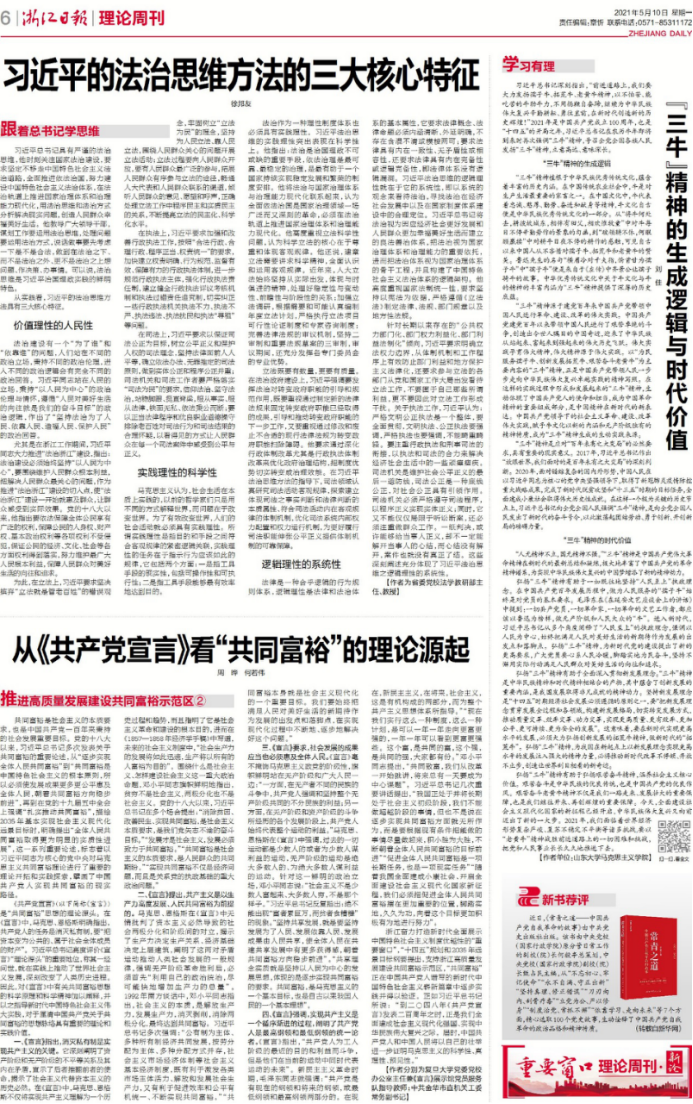 5月10日,《浙江日报》(6版:理论周刊)刊发了公司教师刘佳撰写的理论文章《“三牛”精神的生成逻辑和时代价值》。文章认为,“三牛”精神植根于中华民族优秀传统文化,蕴含着丰富的历史内涵;“三牛”精神源于建党百年来中国共产党带领中国人民进行革命、建设、改革的伟大实践;“三牛”精神是应对“百年未有之大变局”的必然要求,具有重要的现实意义。新时代,弘扬“三牛”精神有助于一如既往地坚持“人民至上”执政理念,有助于全面深入贯彻新发展理念,有助于弘扬艰苦奋斗精神,涵养社会主义核心价值。“三牛”精神是中国共产党伟大革命精神在新时代的最新总结和凝练,极大地丰富了中国共产党的革命精神谱系,为实现中华民族伟大复兴的中国梦增添了新的精神动力。