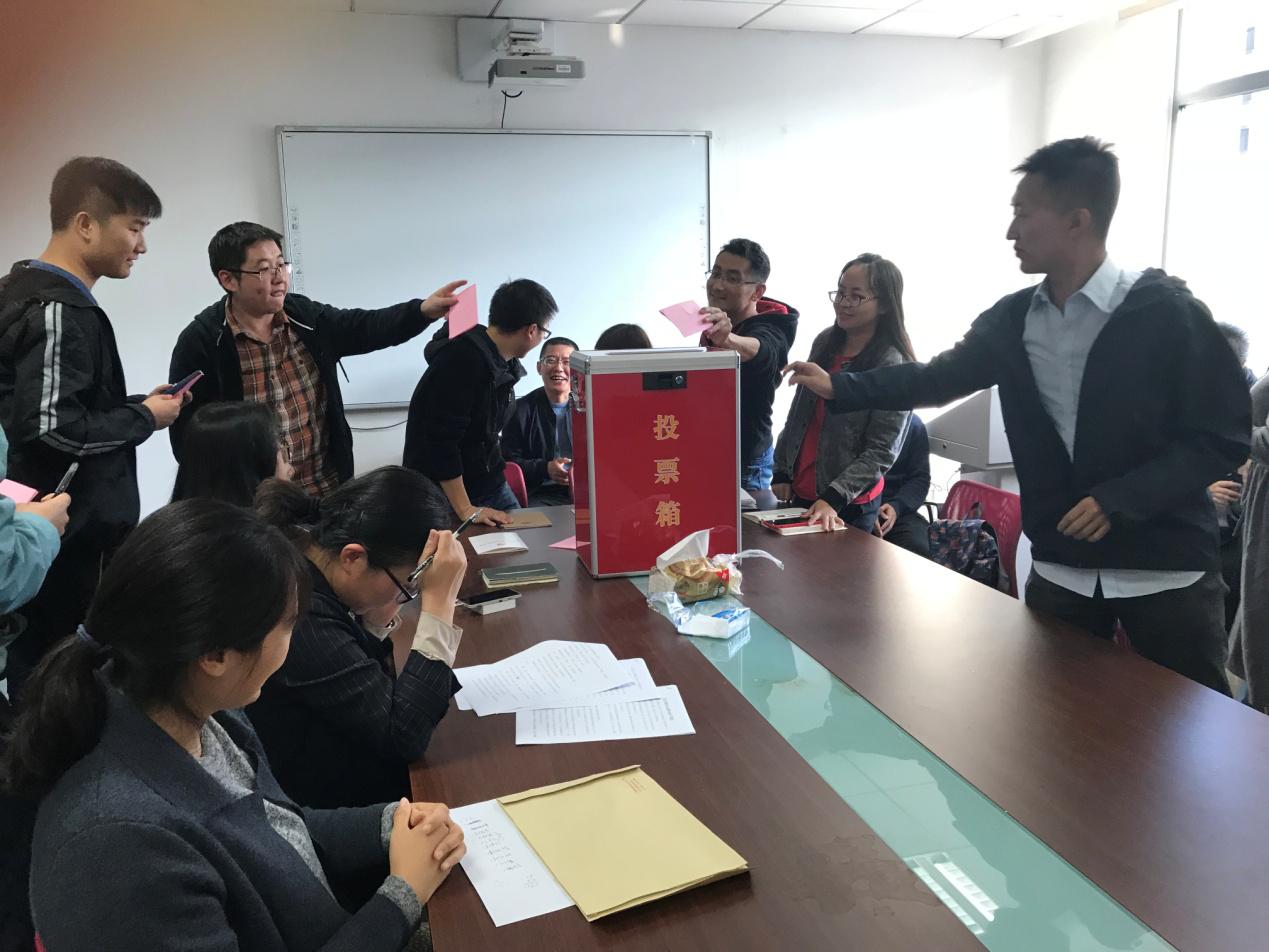 此次选举大会应到党员人数为31人,其中正式党员28人,预备党员3人;实到党员人数为25人,正式党员23人,预备党员2人,支部党员大会按找选举程序进行。孟鹏老师向大会宣读选举办法,全体党员通过举手表决方式,一致通过此次选举办法,并产生了本次选举大会的计票人、监票人。随后宣读经过前期酝酿讨论确定的4名候选人名单及其个人情况,全体正式党员采用无记名投票方式差额选举产生支部委员。
