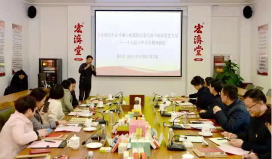 为深入学习贯彻党的十九届六中全会精神,11月25日下午,习近平新时代中国特色社会主义思想概论教研室党支部、机关党支部与宏济堂制药集团党支部联合开展主题党日活动,并参观考察济南宏济堂制药集团有限公司,宣讲全会精神。
