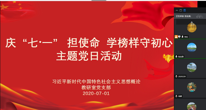 为庆祝中国共产党成立99周年,结合收看“灯塔大课堂”第十一课“榜样讲党课”活动,7月1日下午,习思想概论教研室党支部通过腾讯会议举行了“庆‘七一’担使命学榜样守初心”主题党日活动。