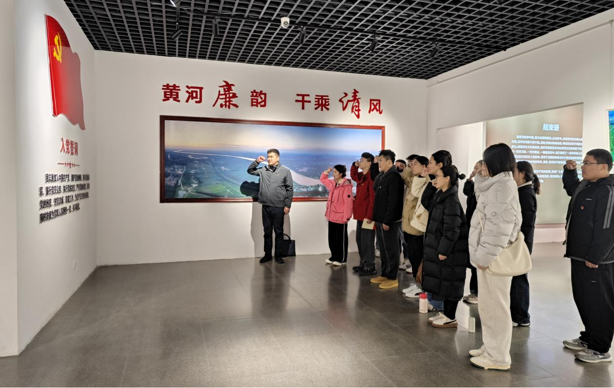 对接洽谈会结束后,同学们来到博物馆顶楼领略黄河的奔腾壮阔,并在“青述黄河”故事宣讲团常务团长王术青老师的带领下一同参观了高青县黄河楼博物馆、“大河清风”廉洁文化展,增进了对黄河地理、黄河文化、黄河治理和廉洁文化的认识与理解。最后,大家一同重温了入党誓词。