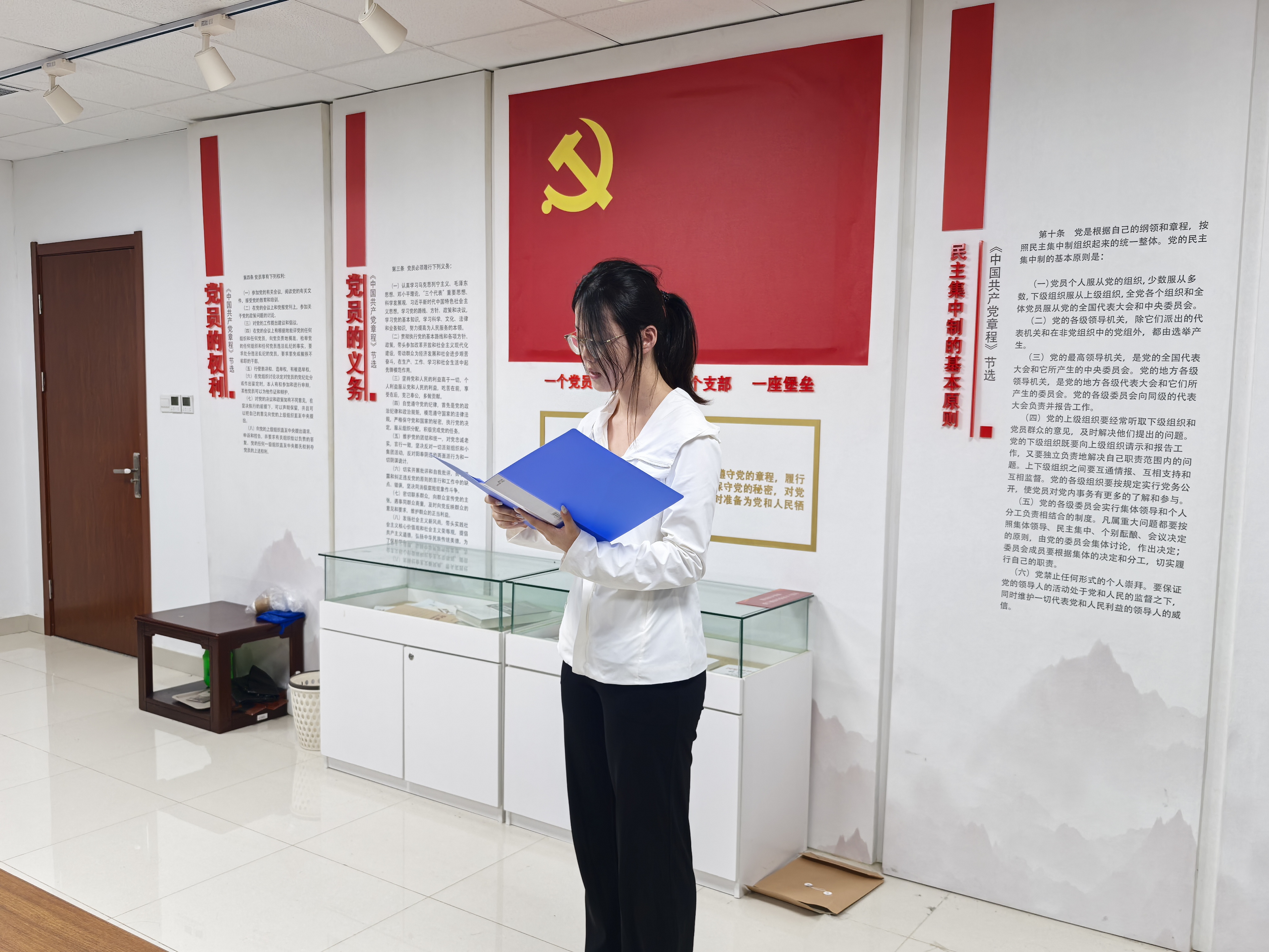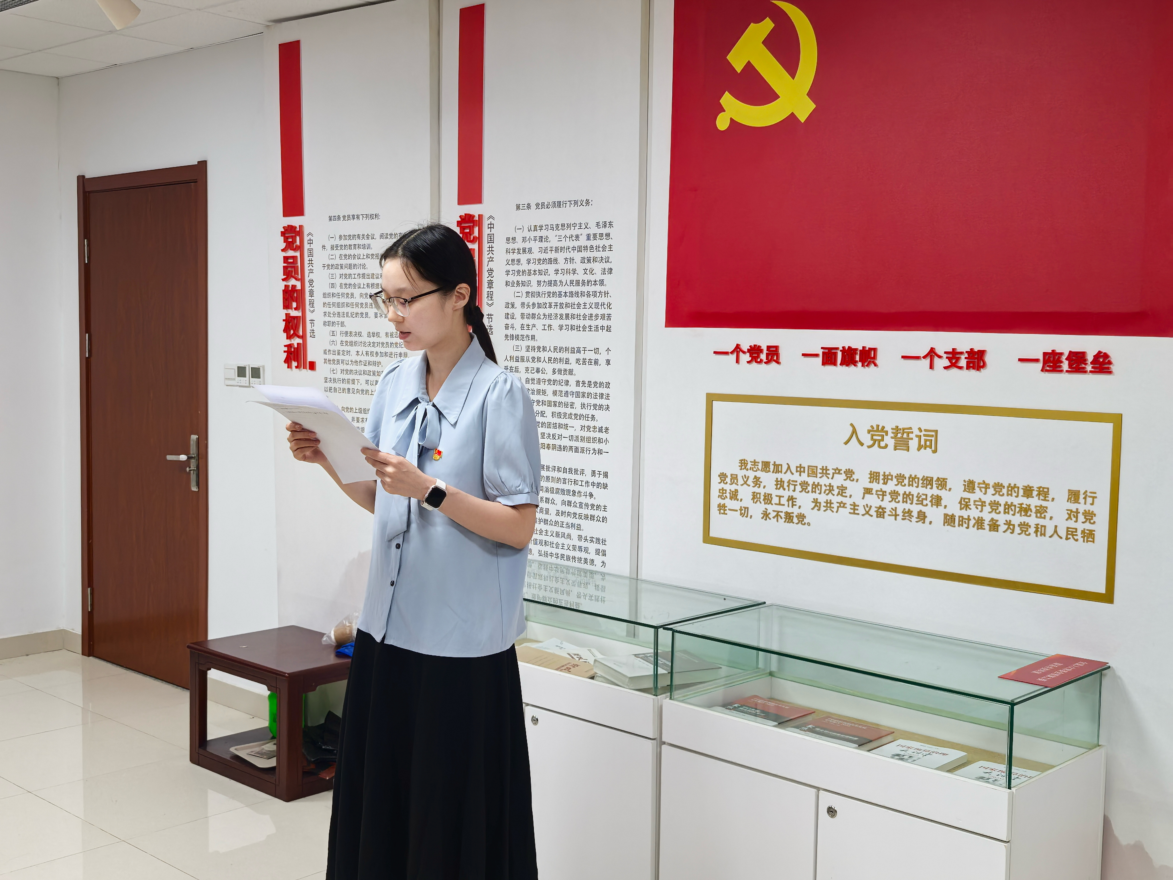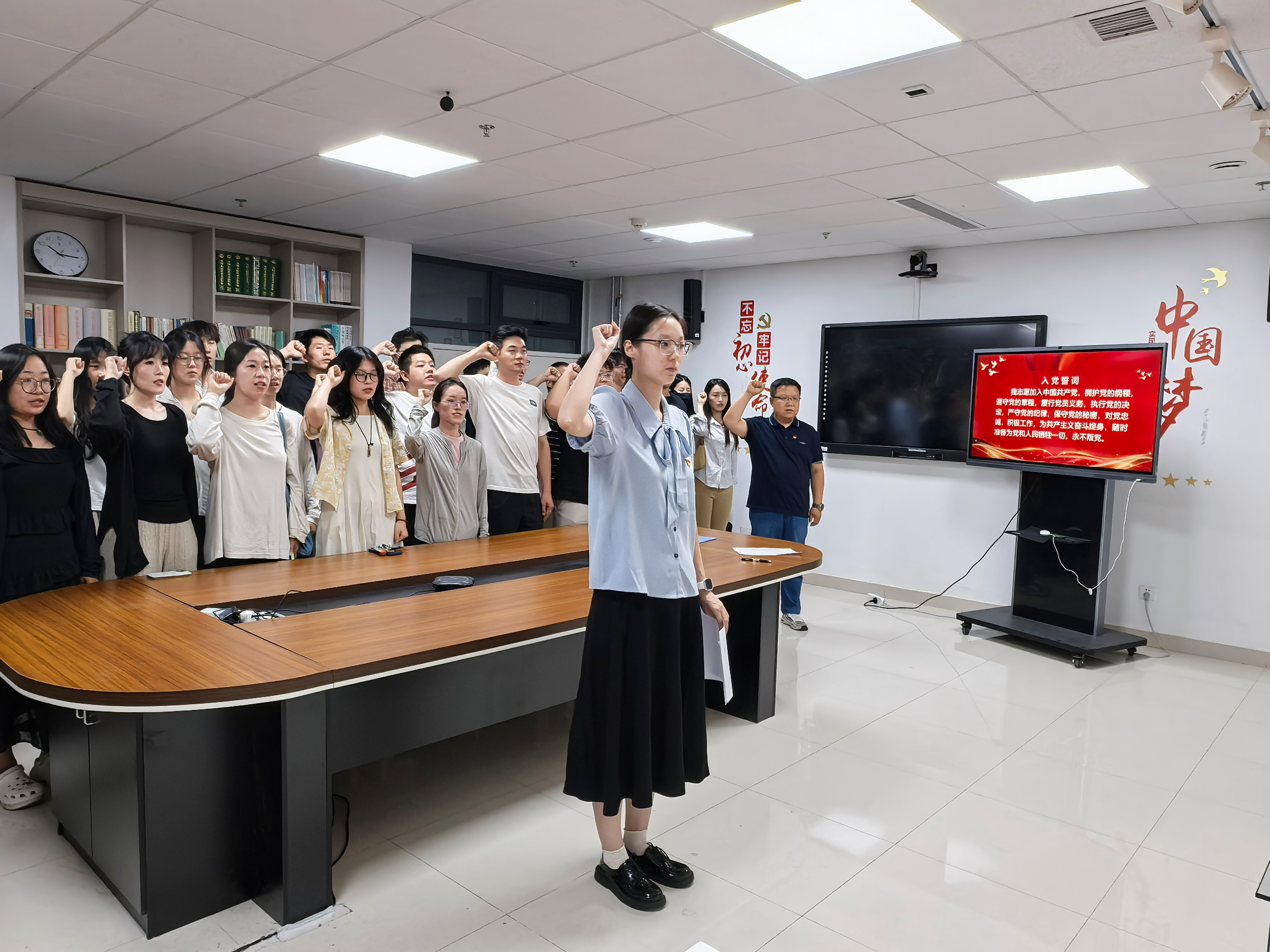 参观结束后,在党员活动室举行了入党宣誓仪式。仪式在激昂的《国际歌》中拉开帷幕,蒋冰妍领誓,全体党员一同宣誓,以铮铮誓言回应习近平总书记“把青春奋斗融入党和人民事业”的时代召唤,坚定了同志们对党忠诚、践行初心的崇高信仰。