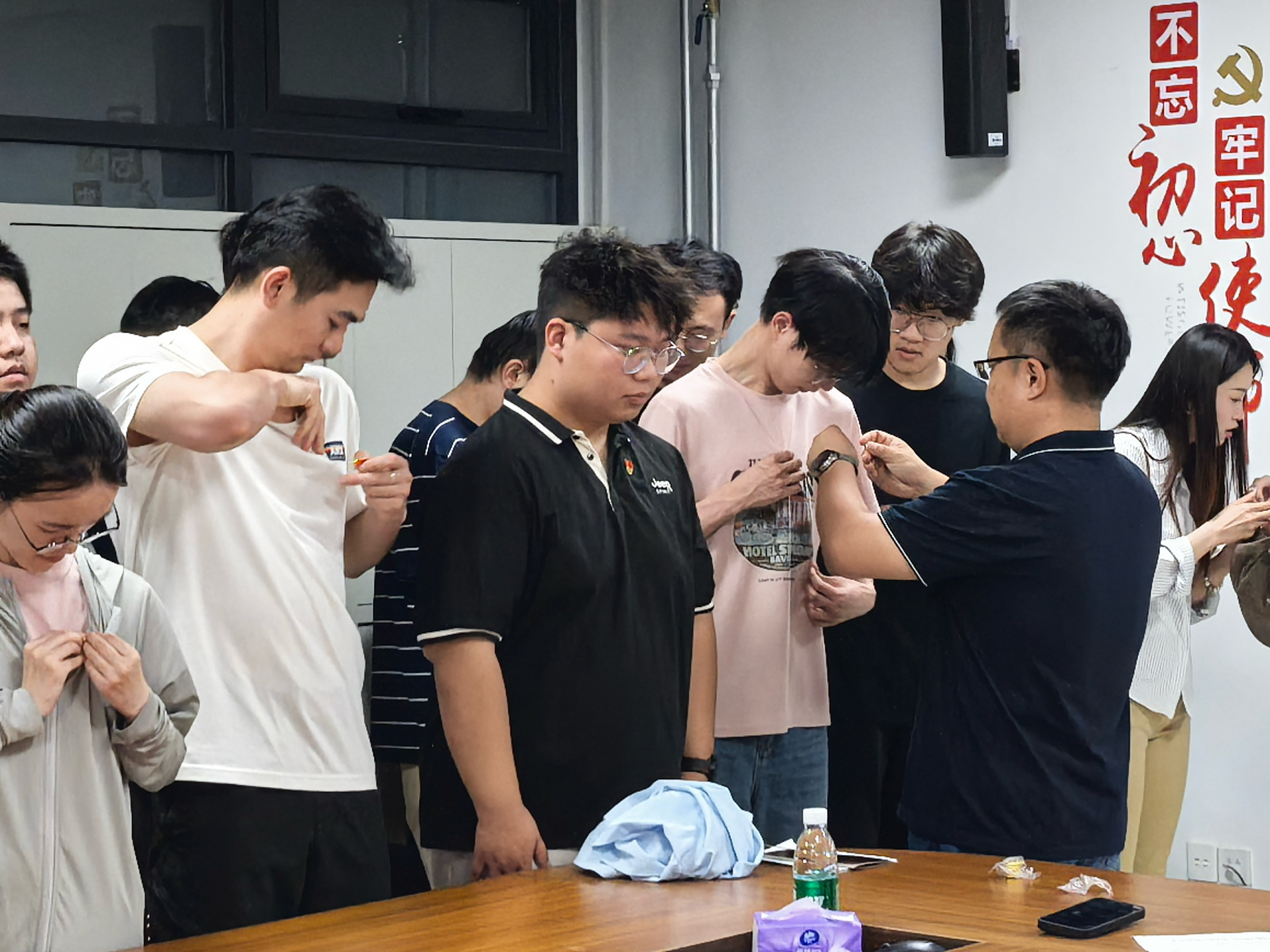 王海宁为新党员庄重地佩戴党徽。党徽佩戴在胸前,标志着新党员正式加入中国共产党,激励着新党员们自觉加强党性修养,自觉履行党员义务,忠实践行党的宗旨,在学习、工作和日常生活中,切实发挥党员的先锋模范作用,肩负起为共产主义事业奋斗终身的崇高使命。