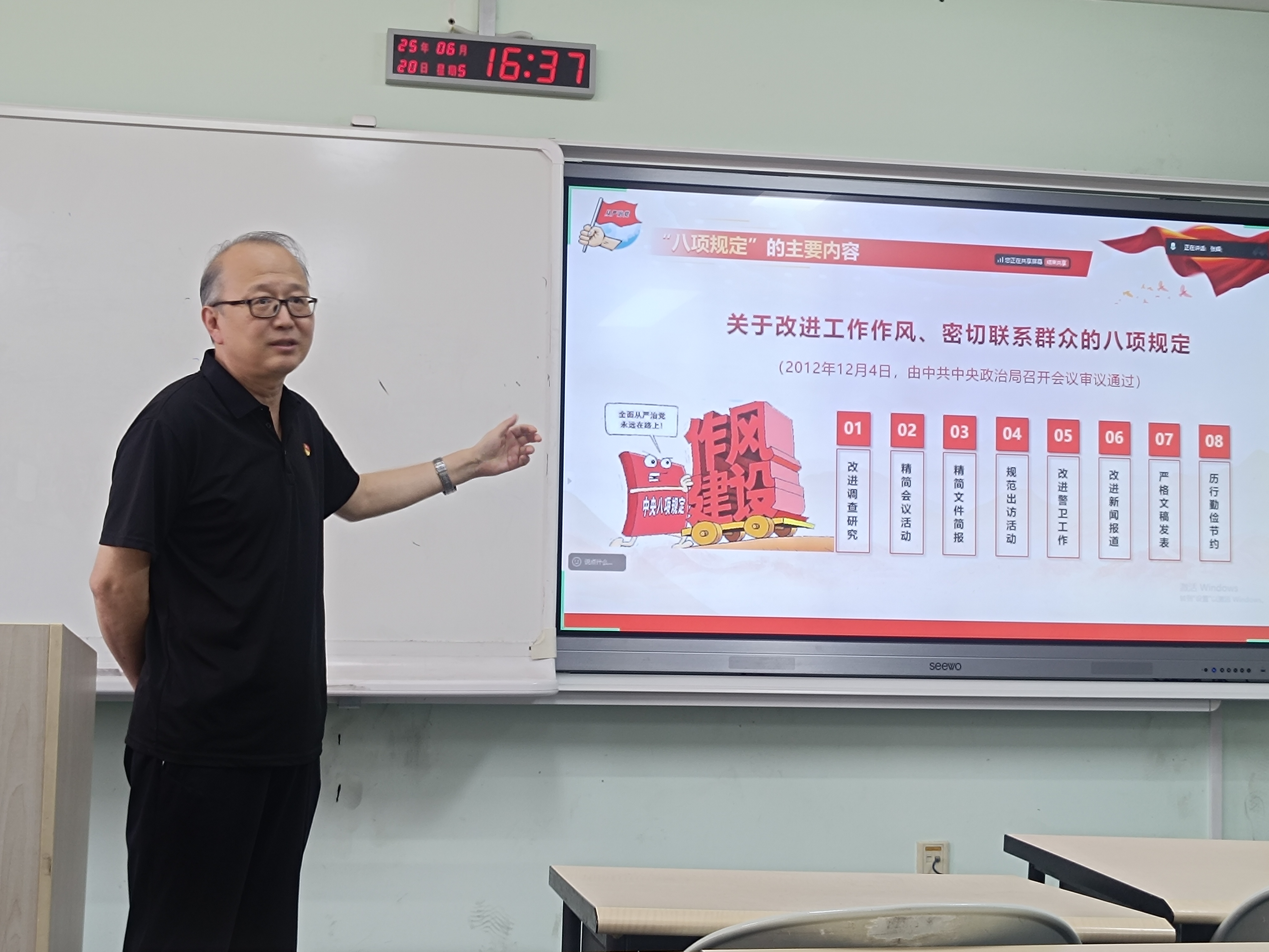 在纪律教育专题环节,英国上市公司365副经理、研究生思政课教研室党支部书记周金龙以《学纪律,守规矩,做优秀共产党员》为题进行讲解,强调党员教师要严守纪律规矩,在公司产品中发挥先锋模范作用,真正做到学纪、知纪、明纪、守纪。国际教育学院于洋作《“八项规定”精神内涵与高校教师要求》专题报告,深入解读了中央八项规定精神对高校教师的具体要求,特别指出要把作风建设落实到教书育人全过程。