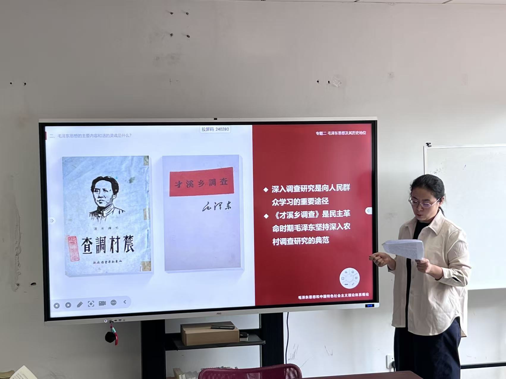 支部副书记张泰同志领学《习近平关于树立和践行正确政绩观论述摘编》中“政绩观问题是一个根本性问题”重要论述,并深入解读习近平总书记在二十届中央纪委五次全会上提出的“四个有没有”的要求。随后,结合毛概论课程中关于“毛泽东思想活的灵魂”相关内容,指出群众路线是树立和践行正确政绩观的核心结合点,并以《才溪乡调查》《为人民服务》为经典案例,生动讲解调查研究的工作方法与全心全意为人民服务的根本宗旨。从毛泽东三赴才溪开展调研的实践,到张思德为人民利益牺牲的事迹,经典案例与正确政绩观的内涵紧密结合,阐明“以人民为中心”是正确政绩观的核心,政绩是干出来的实绩,更是为民造福的“潜功”,支部党员对政绩观教育融入课程教学的思路与意义有了更直观和更深刻的理解。