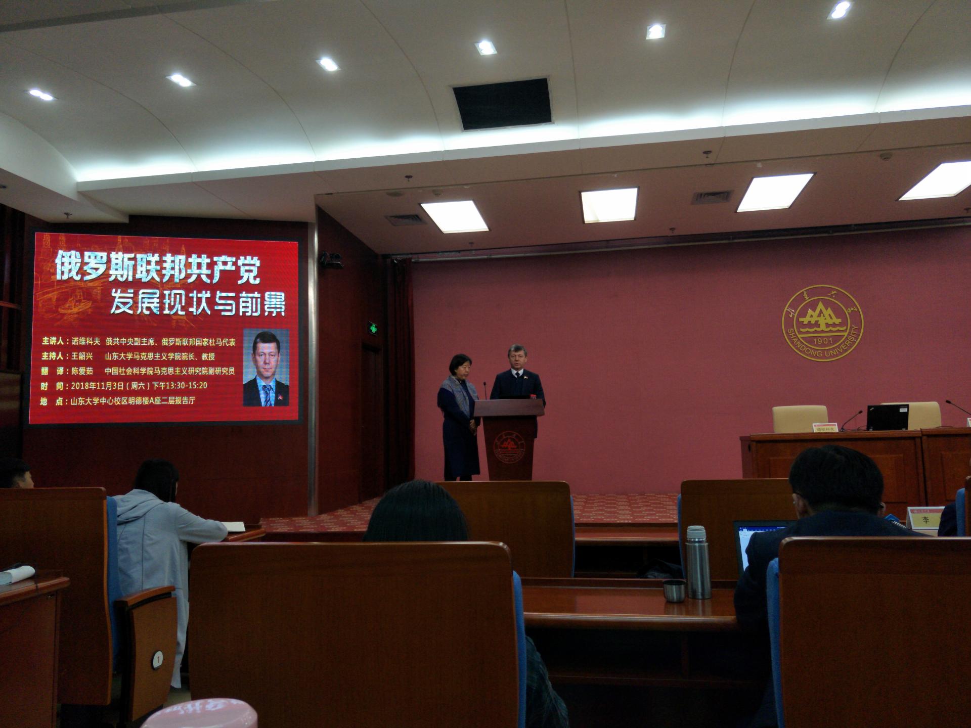 随后,诺维科夫作题为《俄罗斯联邦共产党发展现状与前景》主题报告。诺维科夫对十七次代表大会之后的俄罗斯联邦共产党对历史事件的剖析和党的活动情况进行介绍。他讲到,苏联的毁灭是整个世界的悲剧性事件,苏联为人类做出的贡献主要有:创造了对劳动者的社会保障制度,战胜了法西斯主义,支持了民族解放运动促进世界殖民体系瓦解,创建了世界社会主义体系。列宁和他的同志们最伟大的成就是创建了布尔什维克政党,1917年10月布尔什维克引领民众掀起了蓬勃的社会主义运动,对人类社会发展产生了重大影响。俄罗斯联邦共产党是布尔什维克的继承党,2017年5月召开第十七次代表大会,党员的数量达到了16.2万人,党员的平均年龄55岁,年轻党员占比12%,女性党员占比33%。俄罗斯联邦共产党的任务是让俄罗斯重返社会主义建设道路,为了能够实现这一目标,中央委员会对全党提出了如下的几个任务:第一,俄罗斯联邦共产党应该成为无产阶级的先锋队,要立场坚定地捍卫工人阶级的利益;第二,扩大在社会上的影响力;第三,构建广泛的左翼和爱国力量统一战线;第四,把议会内外的斗争结合起来运用;第五,发展自己的媒体力量,发出自己的声音;第六,加强共产党联盟;第七,积极参加国际共产主义运动。主题报告结束后,现场进入提问环节,师生就感兴趣的问题积极提问,诺维科夫认真仔细地给出了解答。最后由王韶兴总结了报告,该报告在热烈的气氛中结束。