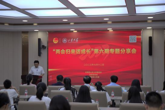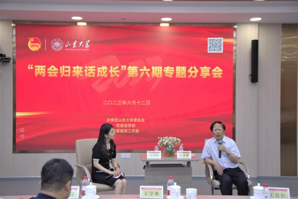 作为连续两届的两会代表,王学典教授首先向大家介绍了他的两会提案。提案充分结合其研究领域,实现经济学、社会学等多学科融合,展现了山大学子的家国情怀与使命担当。在面对现代化、工业化进程中不可避免的碳排放问题时,王学典教授提议“以大数据为基础、社区为单元,水电差异化定价”,充分诠释了“中国式现代化”。此外,王学典教授认为真正推进全党全社会形成历史自觉、文化自信的关键在于精英引领,自上而下筑牢文化自信。他殷切希望山大学子能具备儒家风范、厚植人文精神,在现代化潮流冲击下依旧能够坚守高尚理想,展现道德风尚,无愧于“山大人”的身份。