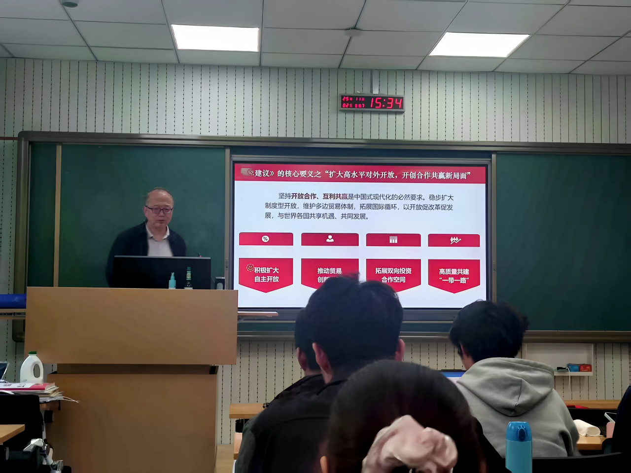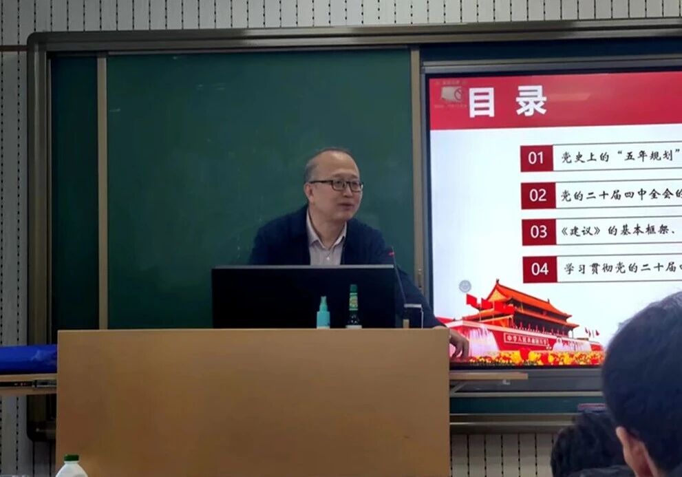 在阐释会议重大意义时,周老师剖析了“十五五”时期作为“基本实现社会主义现代化关键时期”的承前启后作用,结合我国发展基础与环境变化,详细解读了“战略机遇与风险挑战并存”的深刻内涵,并向同学们强调,要深刻领会全会总结历史、擘画未来的核心价值,从发展脉络中把握时代走向,为精准理解国家战略、主动融入发展大局筑牢认知根基。