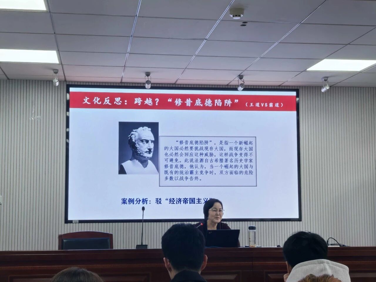 在互动环节,同学们踊跃提问,就坚定文化自信、跨越“修昔底德陷阱”等问题与徐老师展开深入交流。徐教授勉励同学们要不忘本来、吸收外来、面向未来,既要深入学习中华优秀传统文化,又要积极吸收人类文明优秀成果,做文化自信的践行者和传播者。