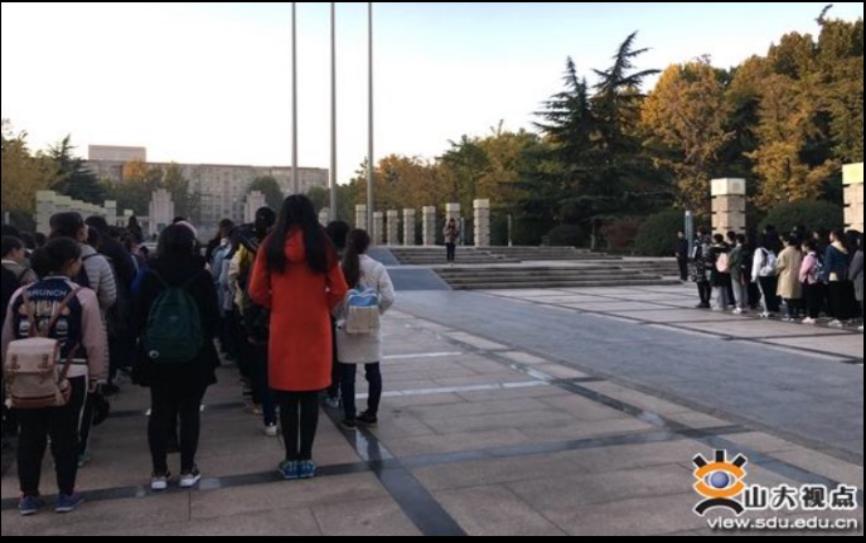 秋风微冷,天朗气清。国旗班列队旗杆前,身着墨绿军服,站得笔挺,目光坚定。晨雾初散的大成广场上还没有员工,只有一位晨练的爷爷在旗杆前站定,默默等待升旗仪式的开始。高中时学校是级部轮流在周一早上举行升旗仪式,所以整个三年只参加过一次而已。没想到大学的自己能再有幸参加一次升旗仪式,并且再次作为员工代表发言。陆续来临的同学们列队站好,国旗班跨着整齐的步伐行至旗杆之下,坚毅浑厚的国歌声里,国旗慢慢升至旗杆顶端。蔚蓝色的高空里,只一抹红在随风飘扬。