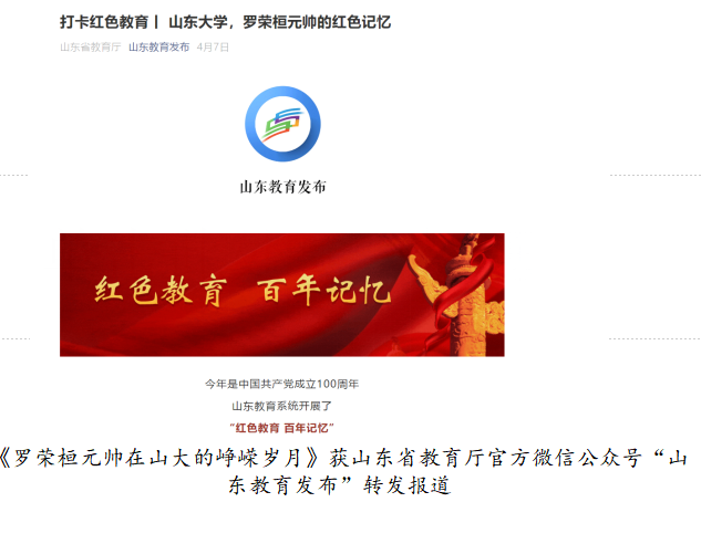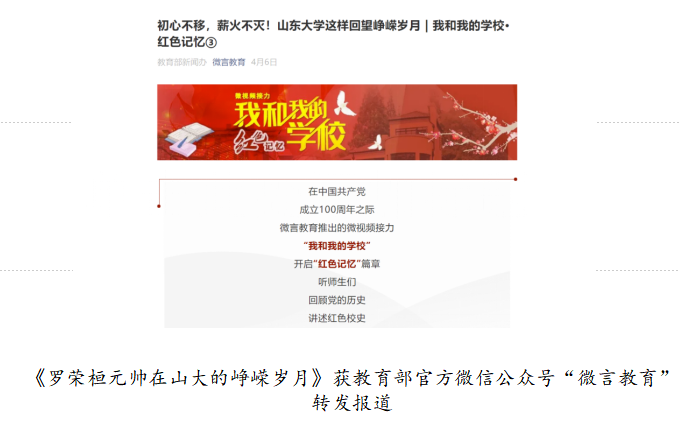 活动启动以来,成仿吾英才班四期学员积极参与摄制,视频作品在“青春山大”等微信公众号上进行登载,在校内外产生了积极反响。其中,《罗荣桓元帅在山大的峥嵘岁月》获教育部官方微信公众号“微言教育”和山东省教育厅官方微信公众号“山东教育发布”转发报道,在社会上引起了较大关注。