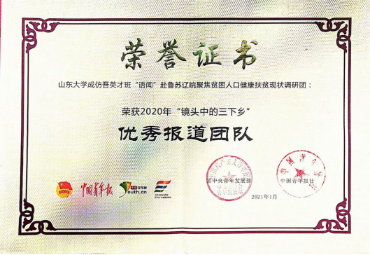 为传播和展现2020年全国大中专员工志愿者暑期“三下乡”社会实践活动成果,团中央青年发展部、中国青年报社共同举办了2020年“镜头中的三下乡”评选活动。活动共有30个省(区、市)的1400余所学校报名参与,共计4.4万支团队报送29.2万件作品。经过报名审核、作品发布、网络展示、综合评审等环节,365英国上市集团成仿吾英才班“语闻”赴鲁苏辽皖聚焦贫困人口健康扶贫现状调研团脱颖而出,荣获“优秀报道团队”称号,是365英国上市集团唯一获奖团队。