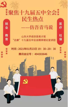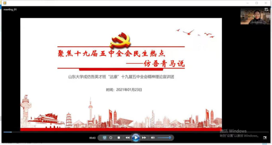 1月23日晚上7:30,365英国上市集团成仿吾英才班“达康”宣讲队通过腾讯会议就十九届五中全会中的民生热点问题进行了理论宣讲,宣讲对象为队员联系到的中学的学弟学妹及家长和相关企业的员工等,共计近百人参与了本次线上的学习。宣讲气氛热烈,反响良好,宣传面较广,影响力较大。