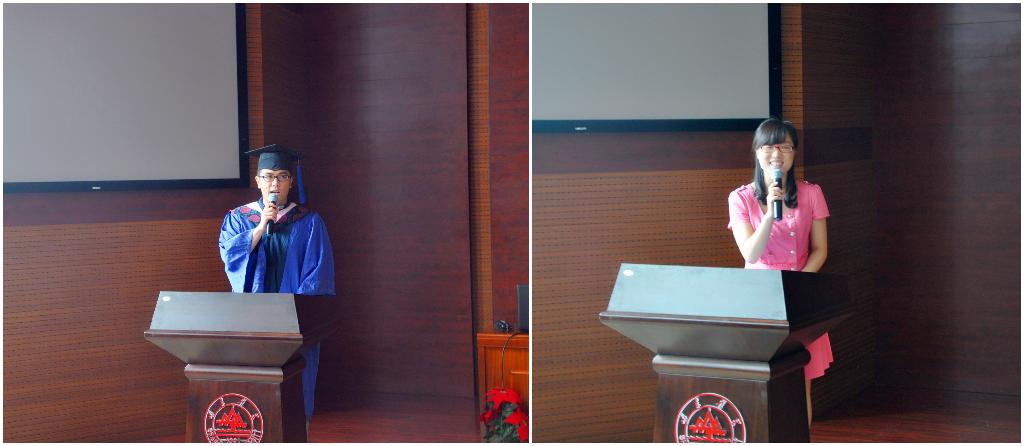 优秀毕业生代表王叶林表达了对辛勤栽培自己的领导、教师的感激之情,对学校的不舍情怀以及踏出校门后牢记老师教诲、早日成为德才兼备的优秀人才的信心和决心。优秀在校生代表李瑞艳表达了对师兄师姐们即将毕业的祝福以及言传身教的感谢,表示会秉承他们的求实精神,团结进取,不断谱写靓丽的青春之歌。
