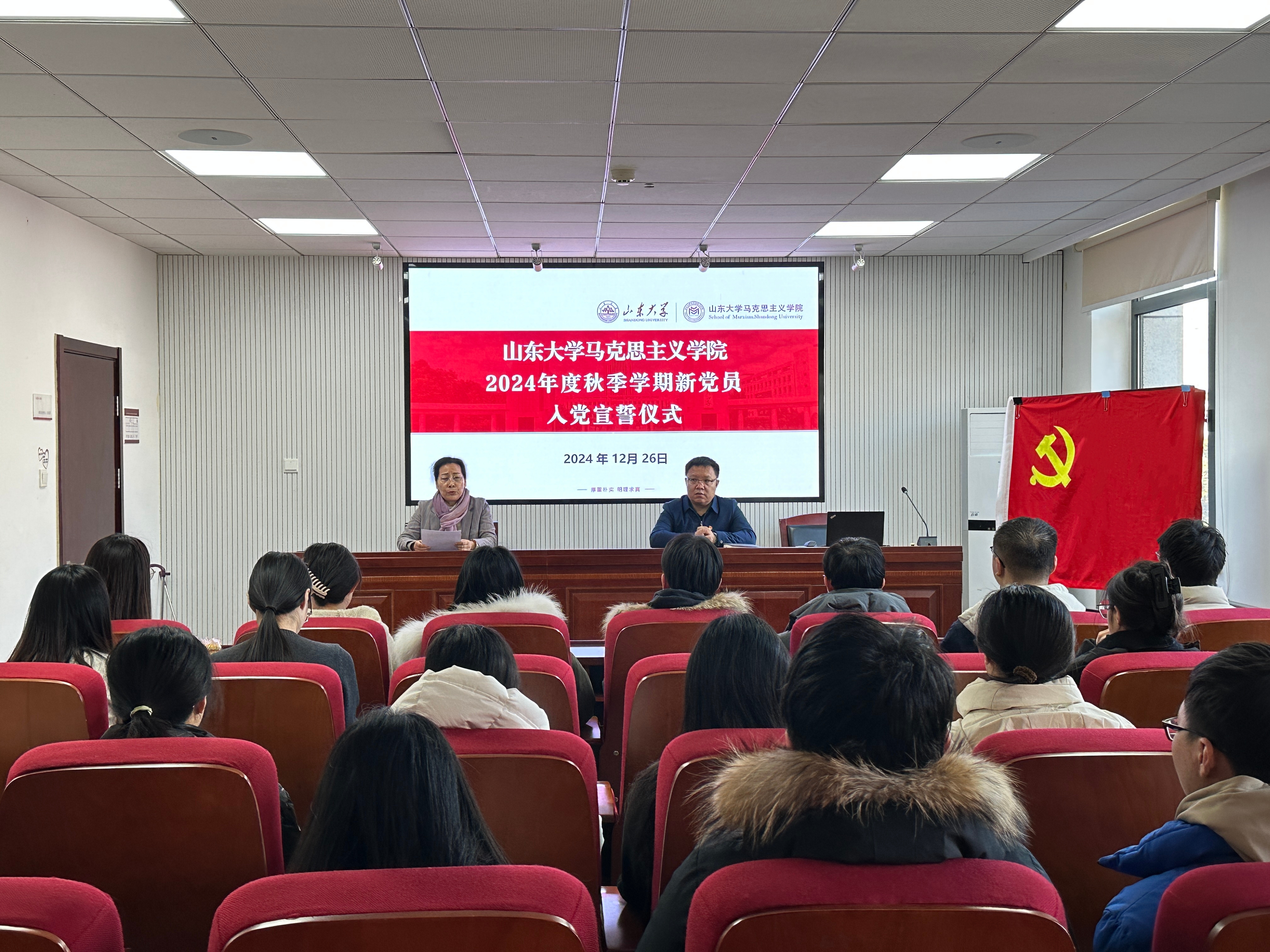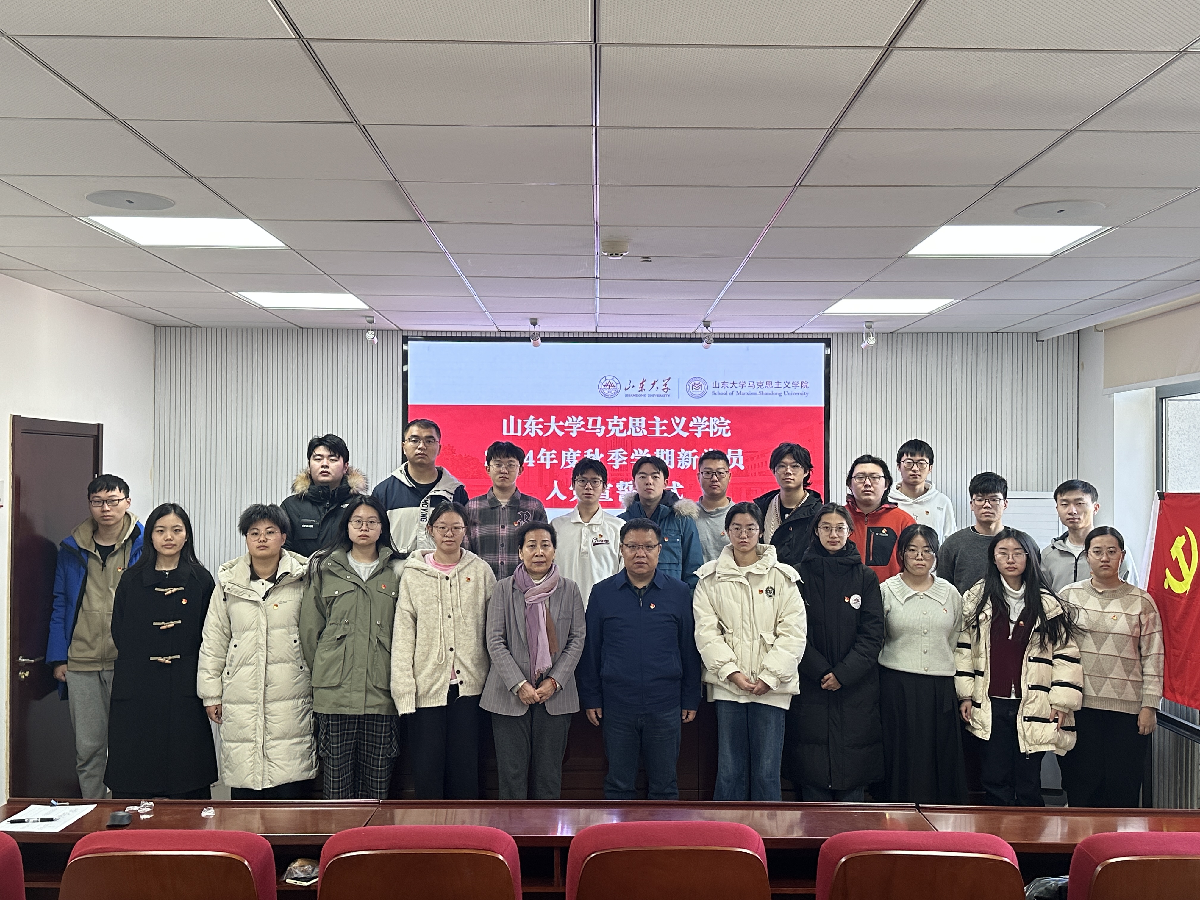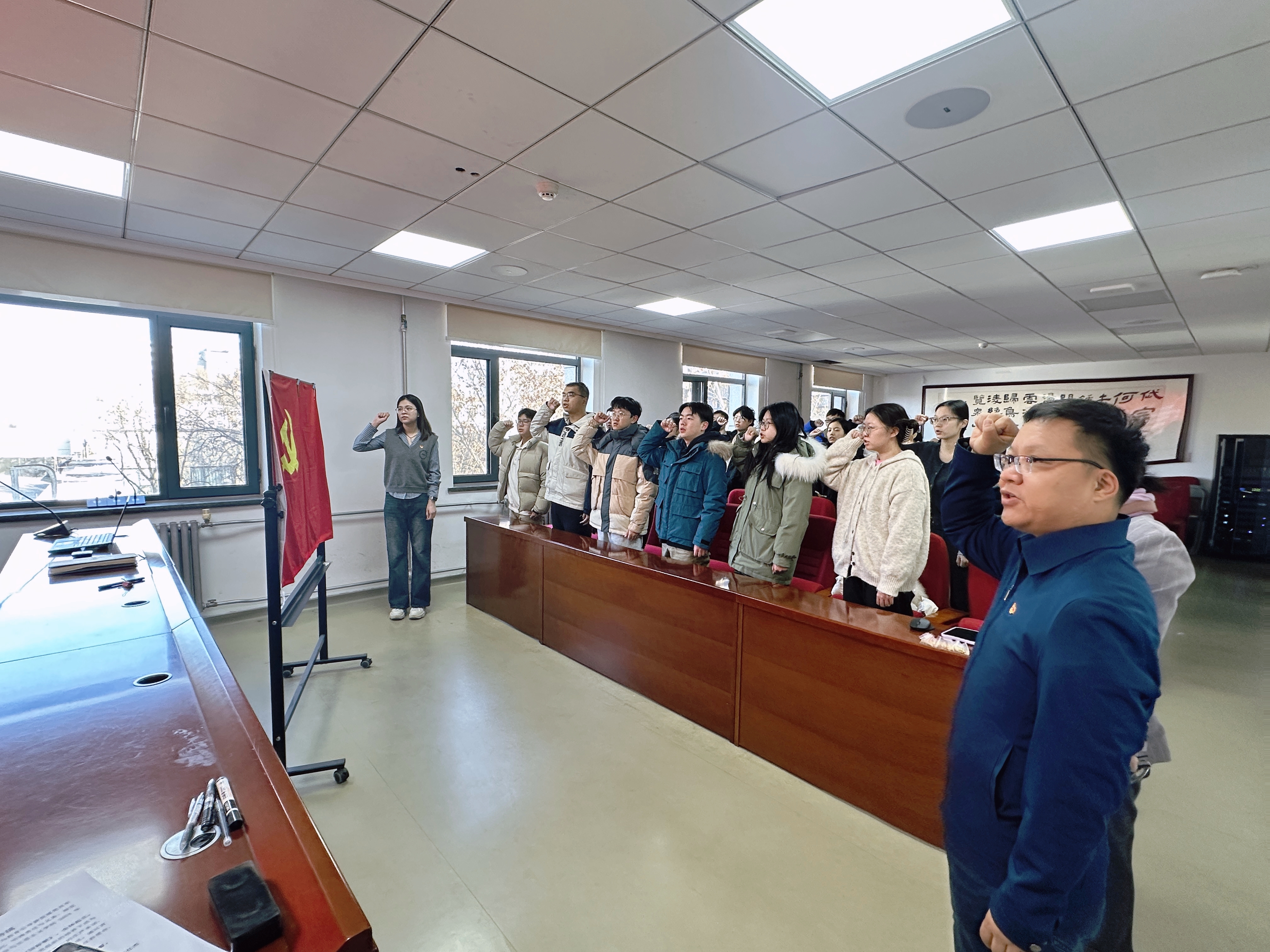 入党宣誓仪式在激昂的《国际歌》中拉开序幕,与会党员全体起立、庄严合唱。在领誓人本科生第二党支部书记王英兵的领誓下,21名新党员举起右拳,面向党旗庄严宣誓,表达对党的坚定信念与为党的事业奋斗终身的决心。