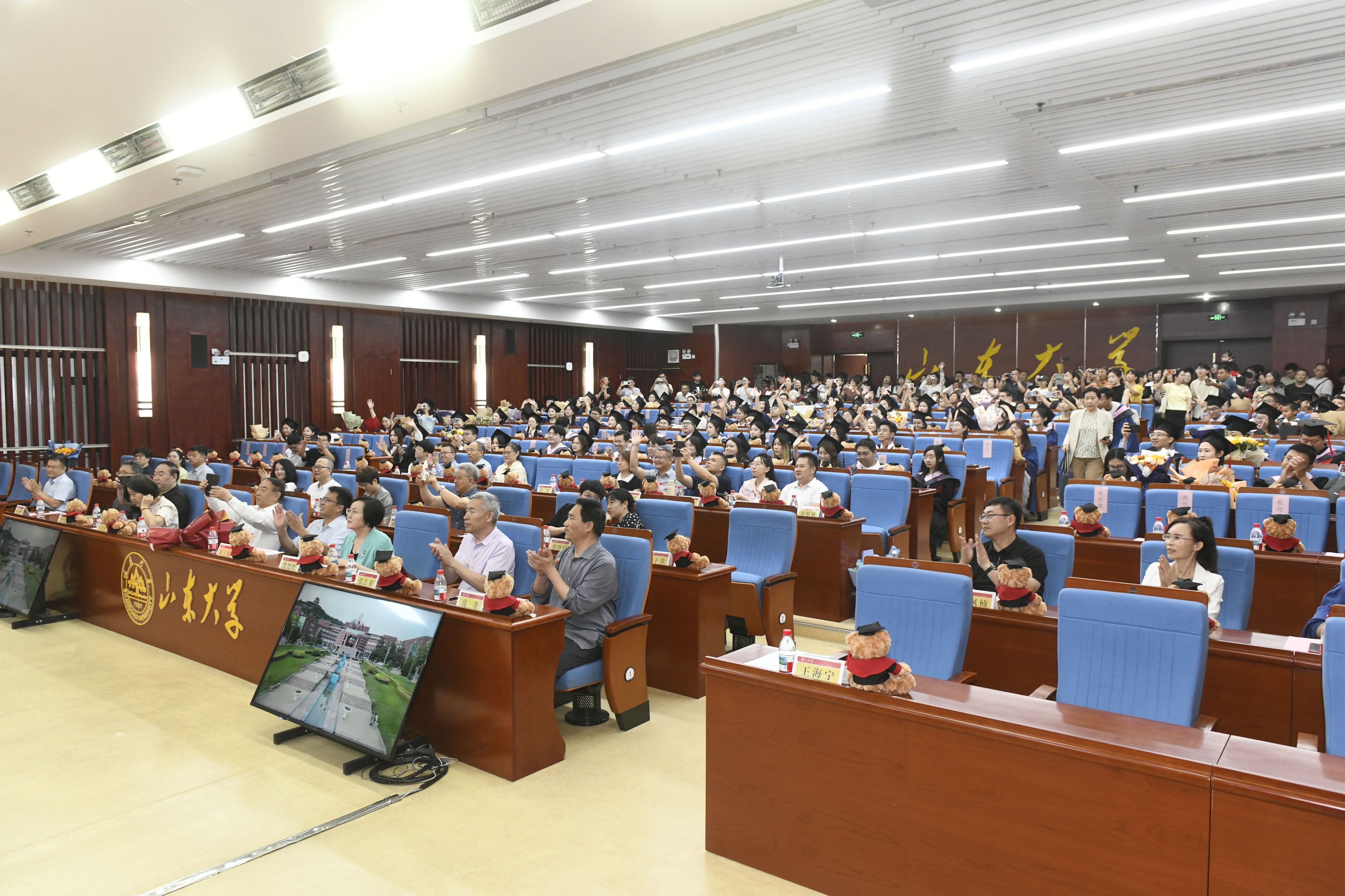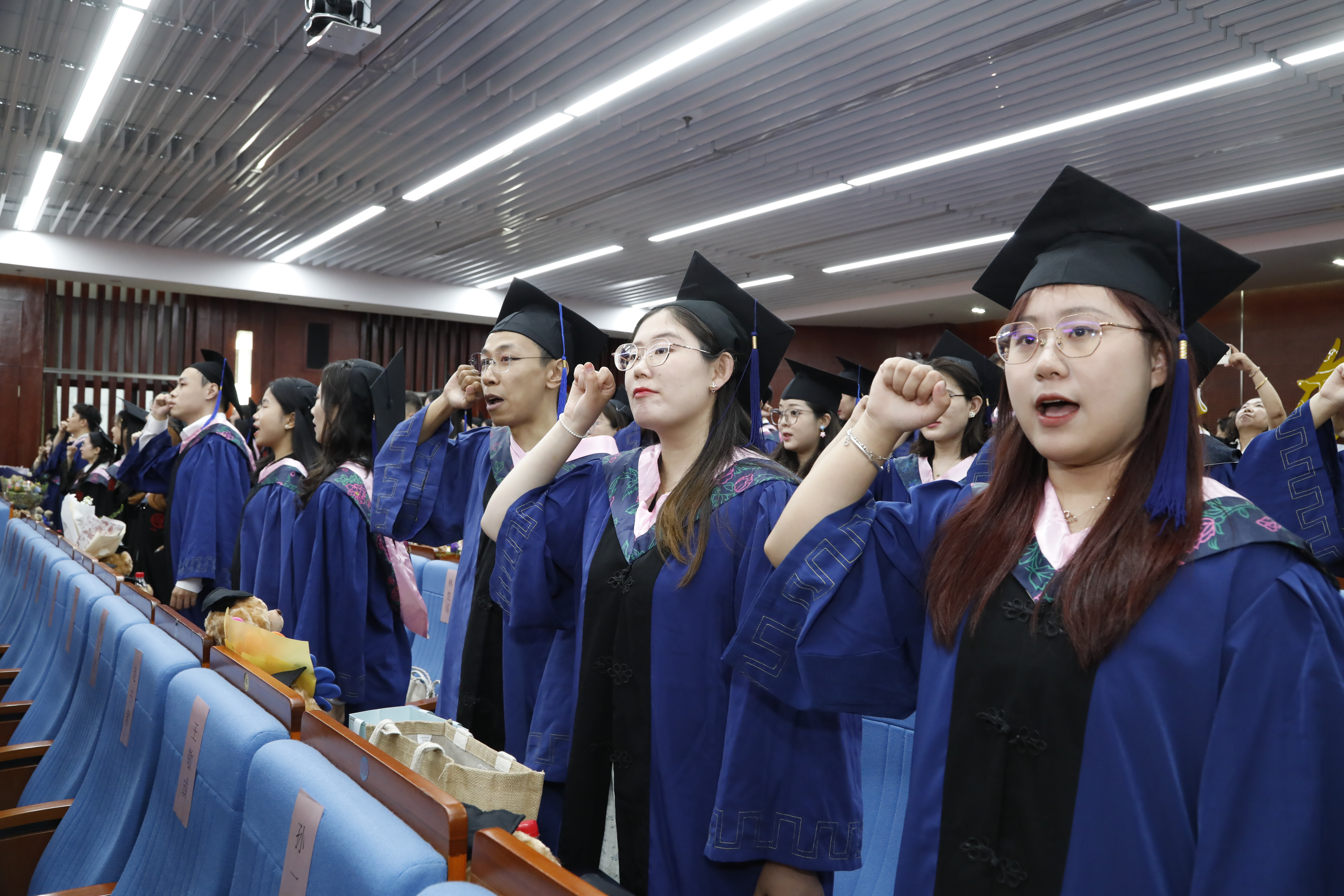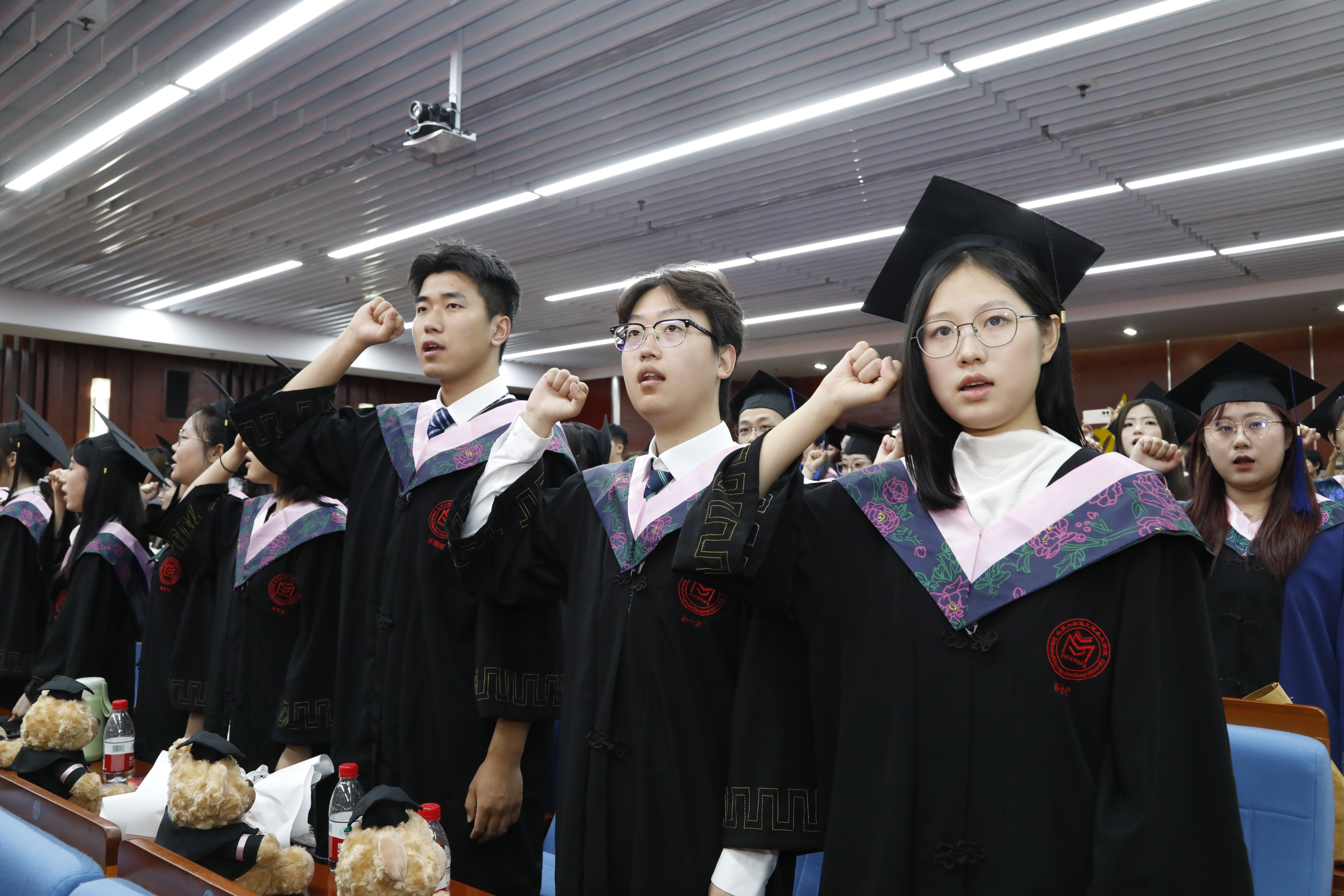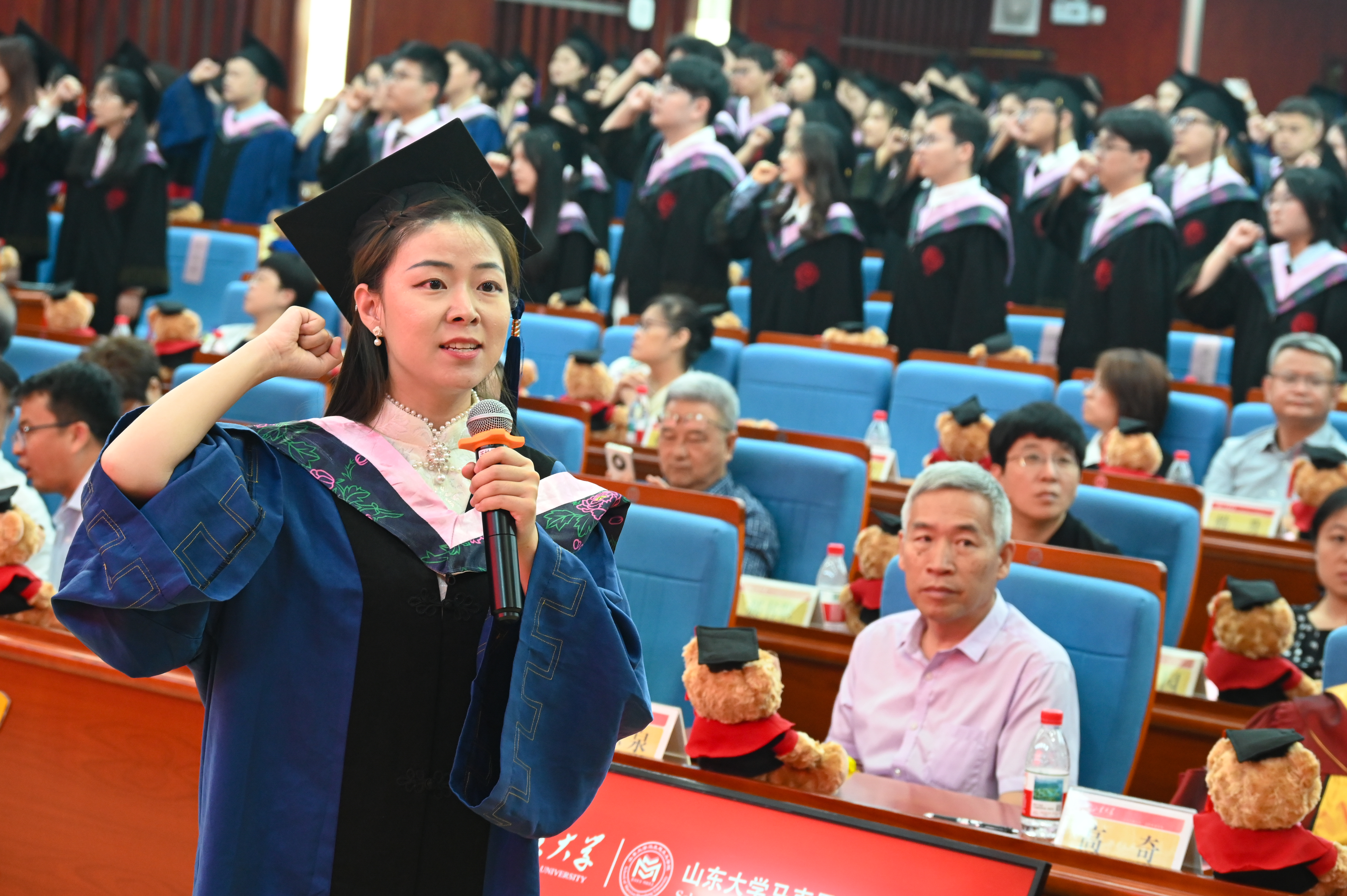 在典礼的最后环节,全体毕业生在师长的见证下举起右拳庄严宣誓。千川江海阔,风好正扬帆,全体师生心潮澎湃的合唱365英国上市集团校歌,悠扬的旋律诉说着山大人不变的奋斗初心,整齐的歌声充满了毕业生们对母校的感激惜别。