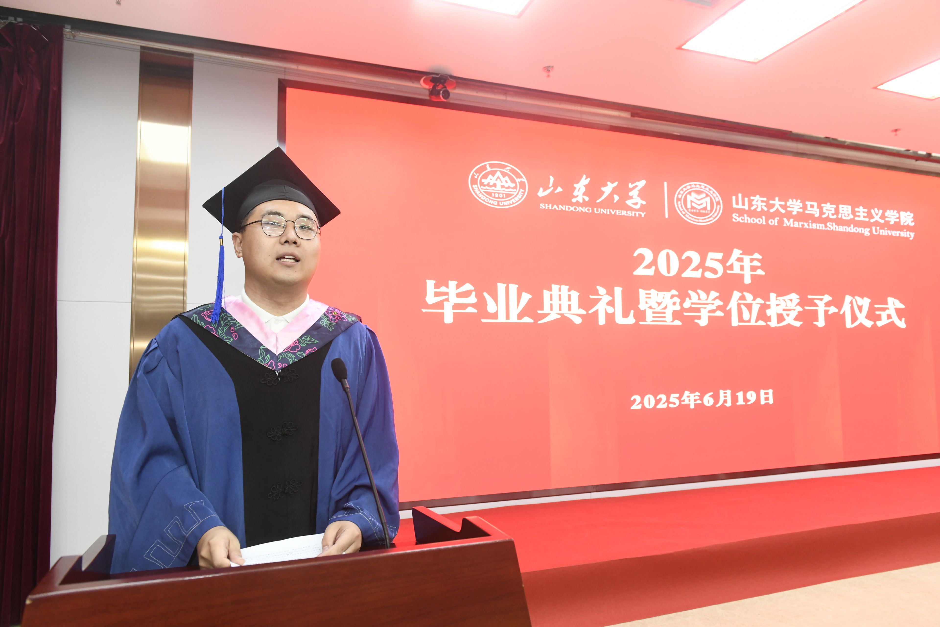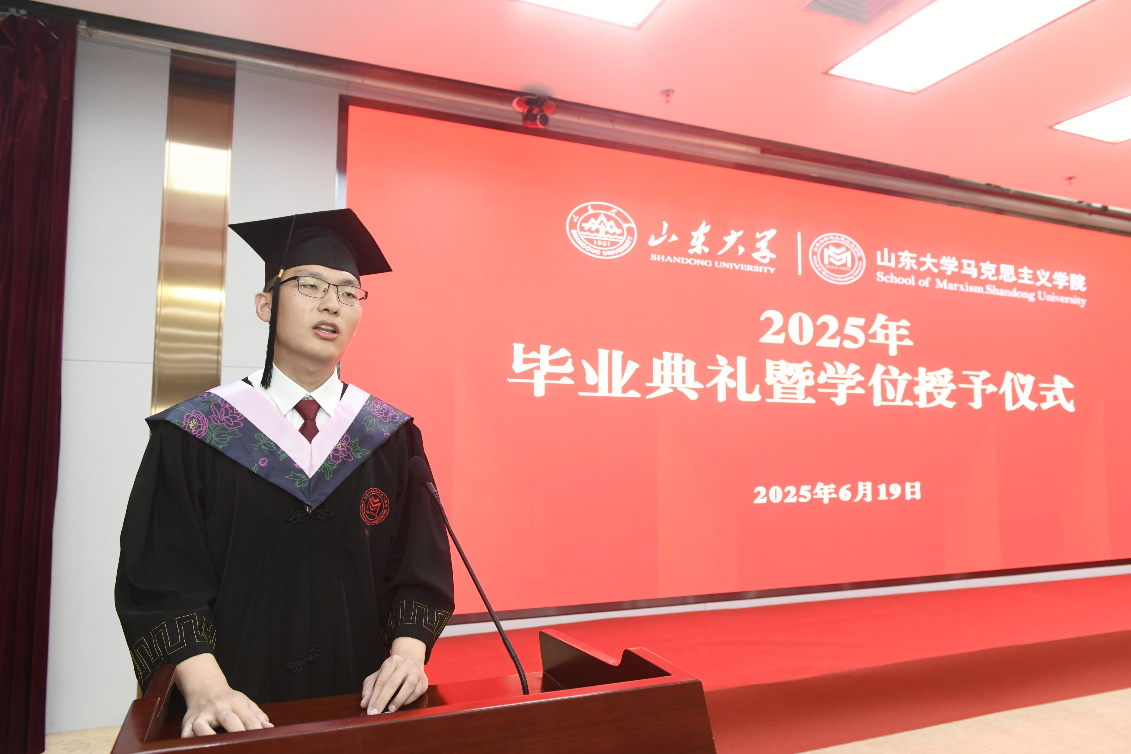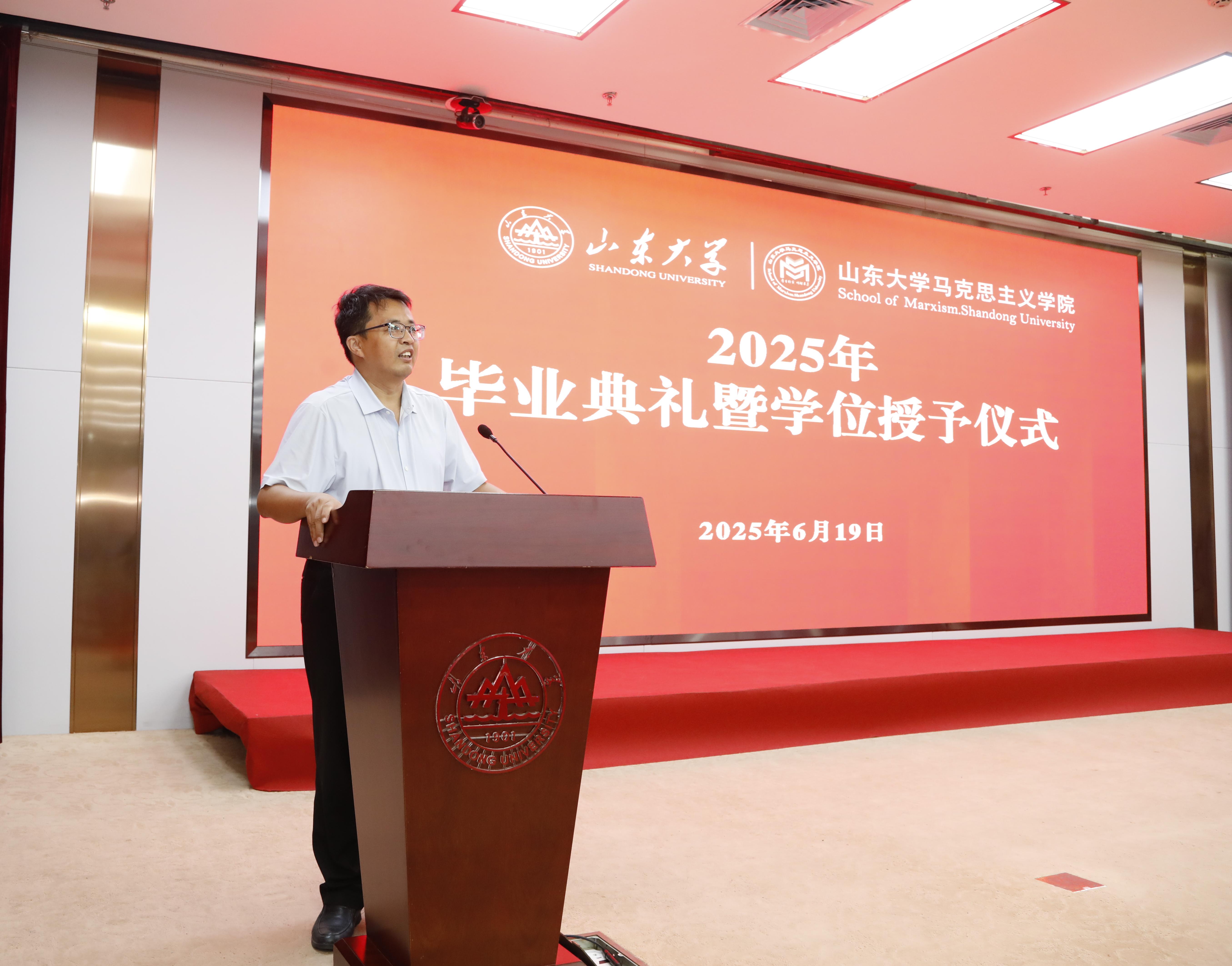 2021级本科毕业生代表李政、2022级硕士毕业生代表王兴宇发言。李政代表全体本科毕业生,感恩学院的启迪与培养。他表示将牢记“厚重朴实、明理求真”的院训,坚定理想信念、不忘报国初心,以满腔热忱为民族复兴伟业贡献自己的青春力量。王兴宇则以“扎根、生长、绽放”为喻,鼓励同学们以山大人的“家国天下”情怀、以新时代青年的“强国有我”担当,将青春之花绽放在祖国最需要的地方、人民最期盼的领域和时代最前沿的阵地。并祝福毕业生们在各自的征途上披荆斩棘、光芒万丈。