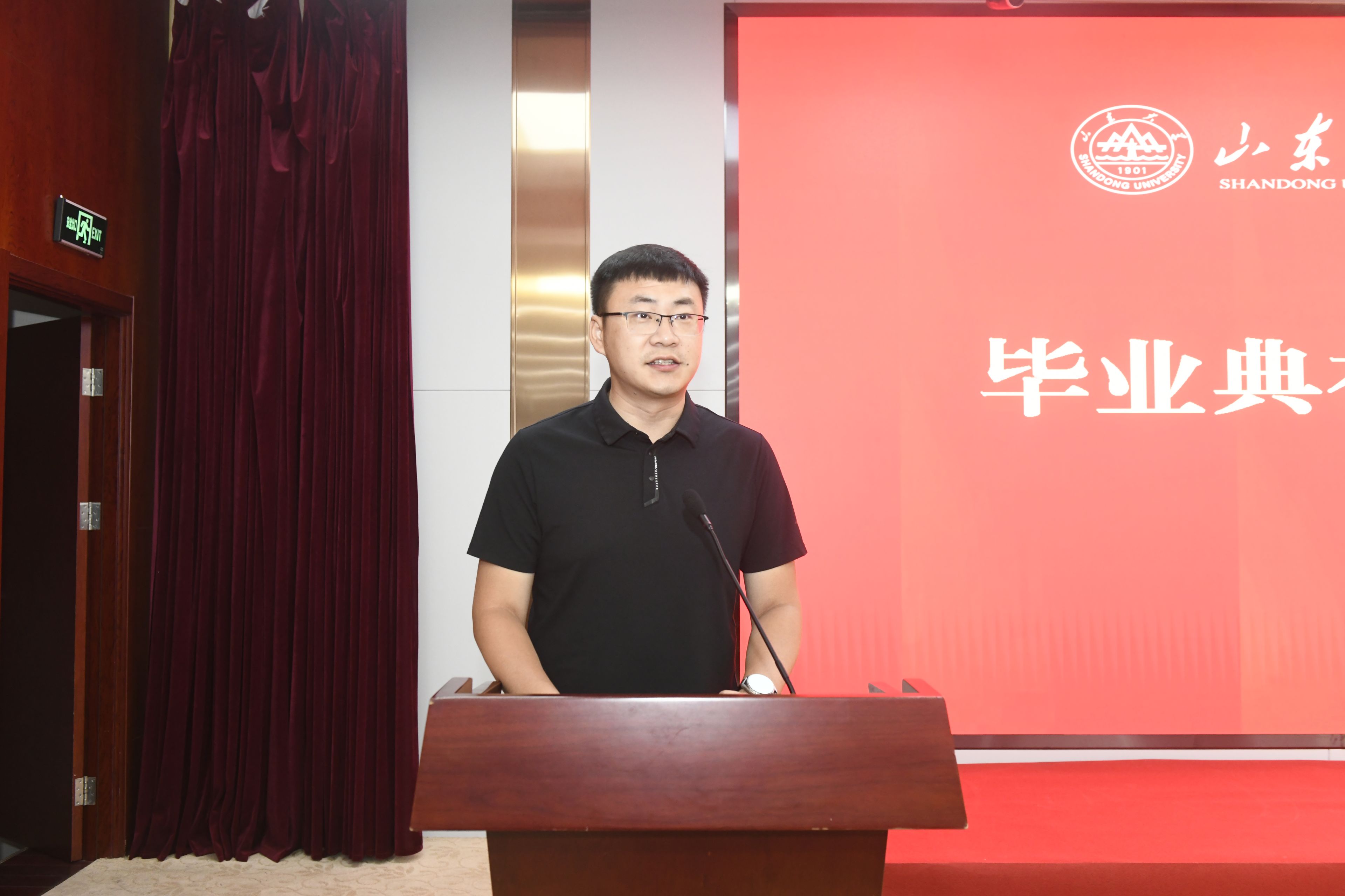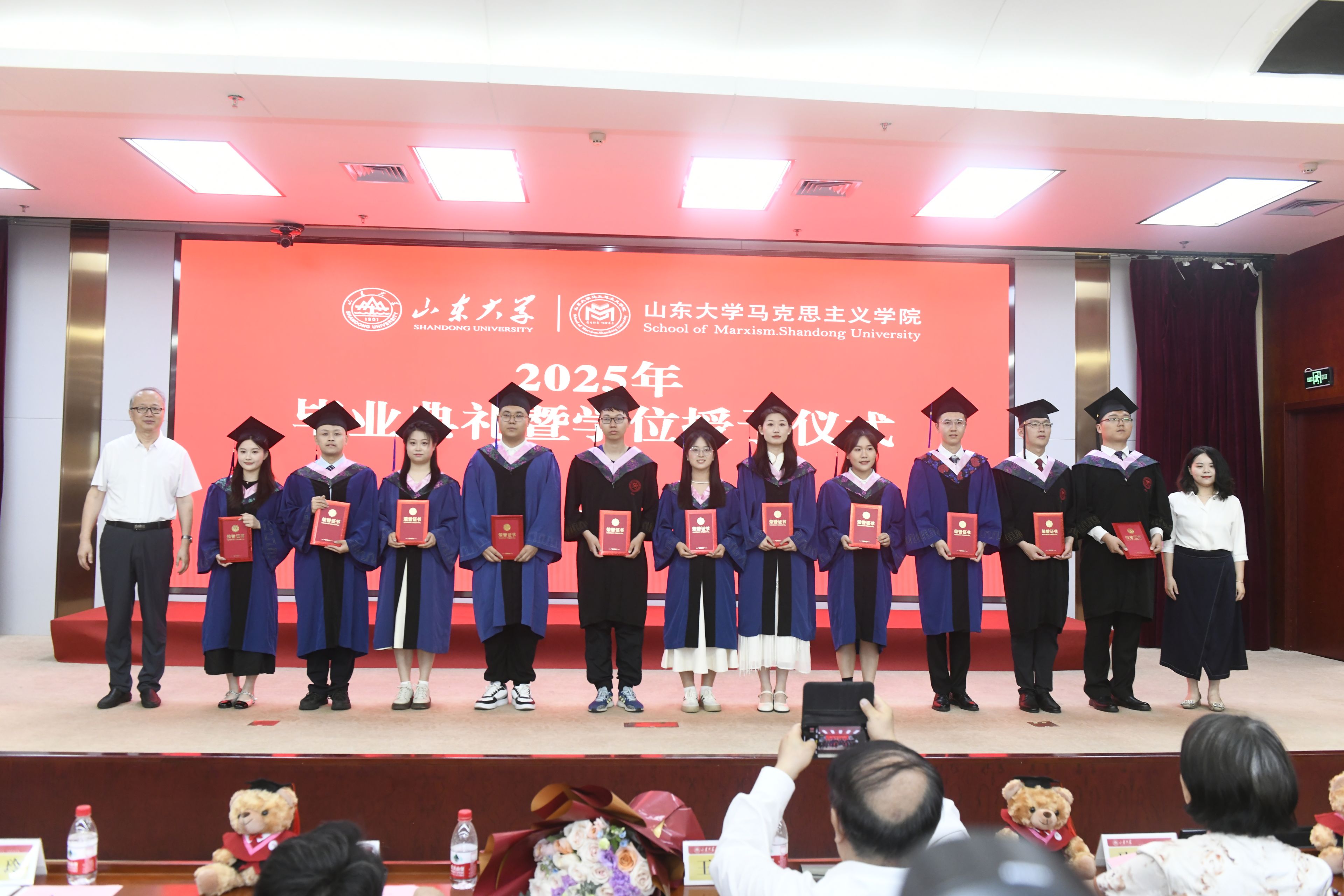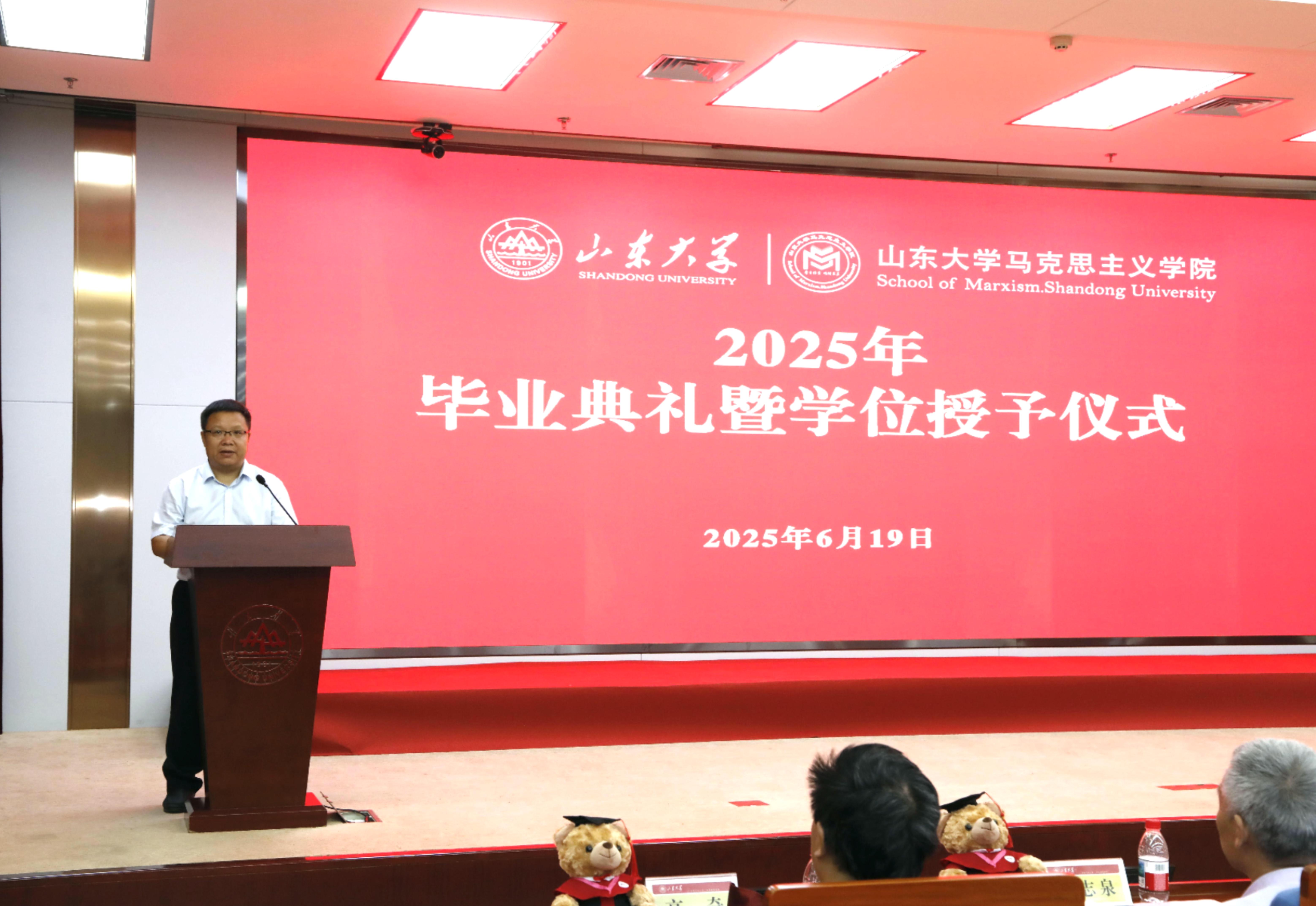 2021级本科毕业生代表李政、2022级硕士毕业生代表王兴宇发言。李政代表全体本科毕业生,感恩学院的启迪与培养。他表示将牢记“厚重朴实、明理求真”的院训,坚定理想信念、不忘报国初心,以满腔热忱为民族复兴伟业贡献自己的青春力量。王兴宇则以“扎根、生长、绽放”为喻,鼓励同学们以山大人的“家国天下”情怀、以新时代青年的“强国有我”担当,将青春之花绽放在祖国最需要的地方、人民最期盼的领域和时代最前沿的阵地。并祝福毕业生们在各自的征途上披荆斩棘、光芒万丈。