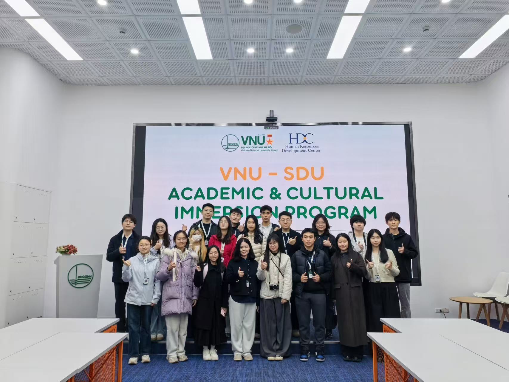 研学团成员乘车来到越南河内大学和乐校区进行探访。校区内独具特色的茶园绿意盎然,菜田蔬果长势喜人,散养的鸡鸭、相伴的犬只勾勒出人与自然和谐共生的校园图景,让同学们感受到别样的校园氛围。大家集中观看了学校宣传片,了解河内国家大学的发展概况、学科布局与学术成就,感受越南河内国家大学深厚的办学积淀、先进发展理念和卓越办学成就。越南河内国家大学为研学团成员颁发结业证书,对同学们的研学表现给予肯定。