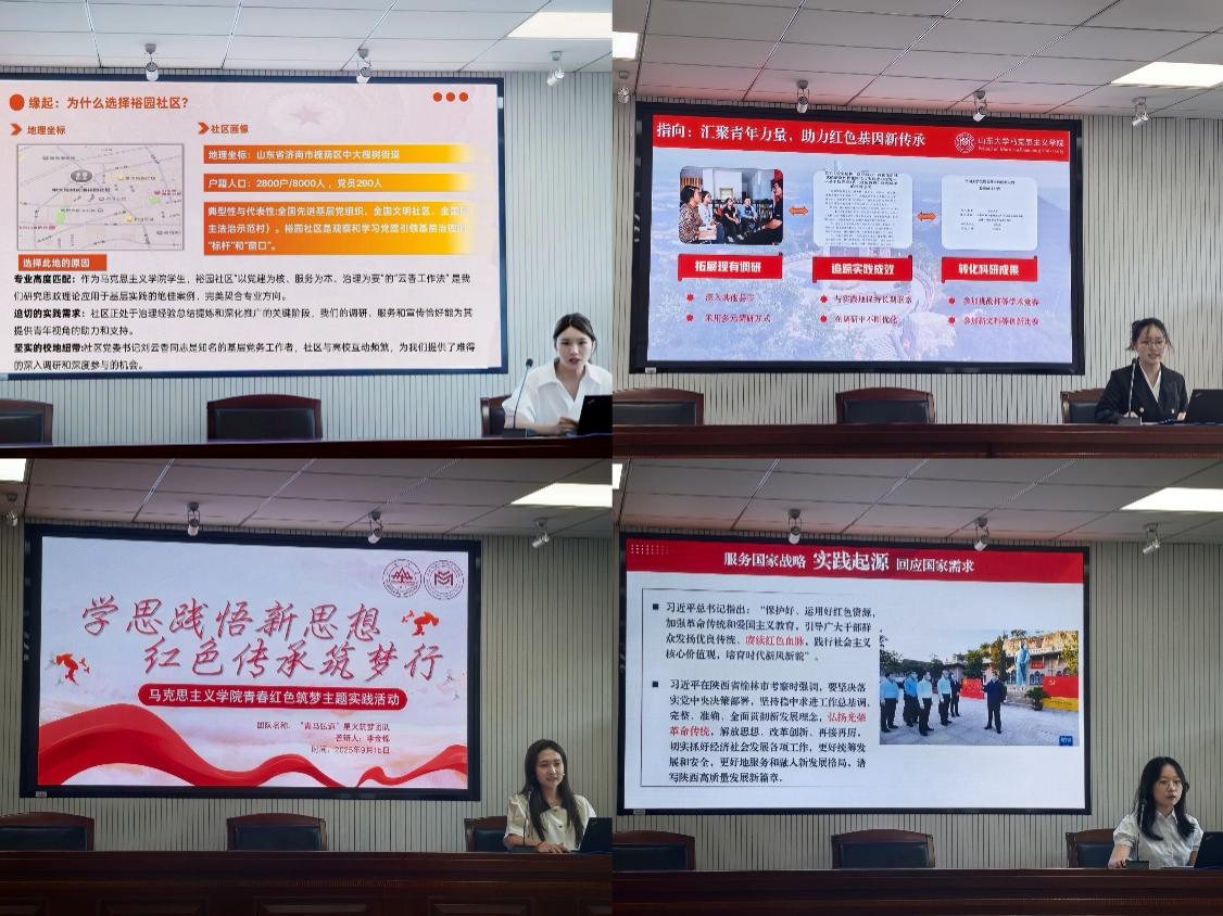 交流会上,各团队分别从前期筹备、实践过程、实践成果和社会反响等方面作总结汇报。“红领裕园行”实践团深入挖掘裕园社区以党建引领基层治理的创新实践,为推进基层治理现代化提供了重要参考;映山红实践调研团深入临沂市四县十一村,通过实地走访和深度访谈,系统挖掘沂蒙精神“党群同心”的制度性转化路径;“青马弘道”星火筑梦团队立足专业优势,积极参与“百万老员工进社区”专项行动,开展理论宣讲与文化服务;赴榆林“聚焦红色基因传承 担当青年使命”暑期社会实践团通过实地研学、座谈交流、文化调研等形式,在历史与现实的交融中学习党的光辉历史,感悟革命先辈的崇高精神;“步岳寻真”实践团面向社区党员开展中央八项规定精神宣讲,推动理论宣传触角延伸至居民日常生活;“身临其境”团队以多元形式打破思政教育时空壁垒,推动党史学习教育从“被动接受”转向“主动参与”,为新时代高校思政实践育人探索特色路径;“兴文知行”实践团聚焦大运河文化所蕴含的丰富的思政教育资源,协力探索运河文化融入思政教育的独特路径;赤迹寻踪实践调研团系统梳理红色基地中的革命精神内涵,挖掘基层革命故事,为地方社会精神建设提供价值指引。
