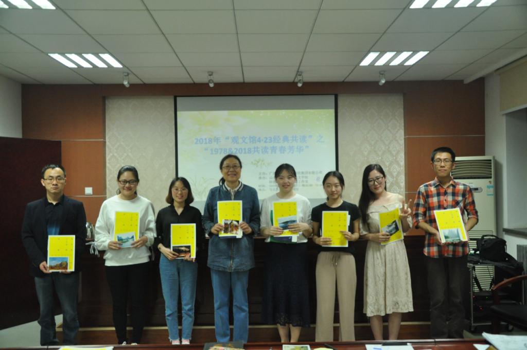 晚上19时,以“1978&2018共读青春芳华”为主题的“观文馆4.23经典共读”活动在学院402室举行。本次活动主要包括阅读经历分享及推荐、经典演绎、颁奖三个环节。在阅读经历分享及推荐环节,科技与人文面对面工作室主任孙庆霞老师向我们分享推荐了她员工生涯中最有影响力的一本书——《物种起源》,并倡议同学们多读经典、勤于思考。随后,翟正男博士、杨鹏博士、杨卫华博士、李桦硕士都以自身的阅读经历为例,谈心得、讲体会,向同学们系统阐释了“为何读书,读什么书,怎样读书”等问题,引起了在场同学的高度共鸣,大家一致认为要将阅读融入到生活中,让阅读真正成为一种“悦”读。在经典演绎环节,丁玲与朱俊仿两位同学作为朗读者,分别为我们朗读了《我不愿成为拆散你们的根源》和《奶奶的星星》两文,声情并茂,感人至深,在场很多同学不禁潸然泪下。随后,郭小铭与邹晓宇两位同学作为传唱人,携手献上了经典曲目《水调歌头》,歌声悠扬婉转,仿若词人细语喃喃。活动接近尾声,书香卷气犹存,科技与人文面对面工作室主任孙庆霞老师为表现优秀的获奖者颁发了证书、奖品并同大家合影留念。