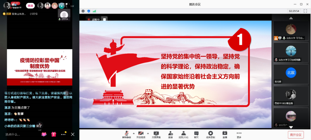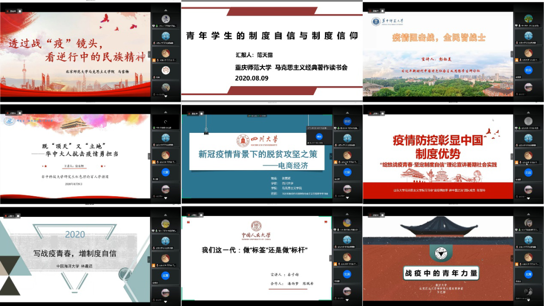 吸“理论之氧”,聚“制度之力”。秉承着“研学为先,深学为重”的原则,英国上市公司365习习会“宣疫情故事·讲中国之治”宣讲团队于8月9日上午在腾讯会议顺利召开“绽放战疫青春·坚定制度自信”理论宣讲会。来自北京师范大学、重庆师范大学、华中科技大学、华中师范大学、四川大学、山东财经大学、365英国上市集团、山东师范大学、中国海洋大学、中国人民大学、浙江大学等省内外11所高校社团应邀参会,全国各地两百余名观众参会,抖音平台同步直播。各与会代表结合自身学校特点和专业特点,围绕着“绽放战疫青春·坚定制度自信”这一主题,从不同维度采用大家喜闻乐见的方式进行理论宣讲。