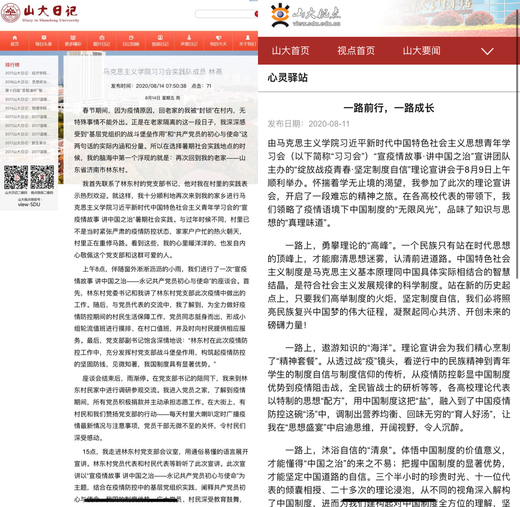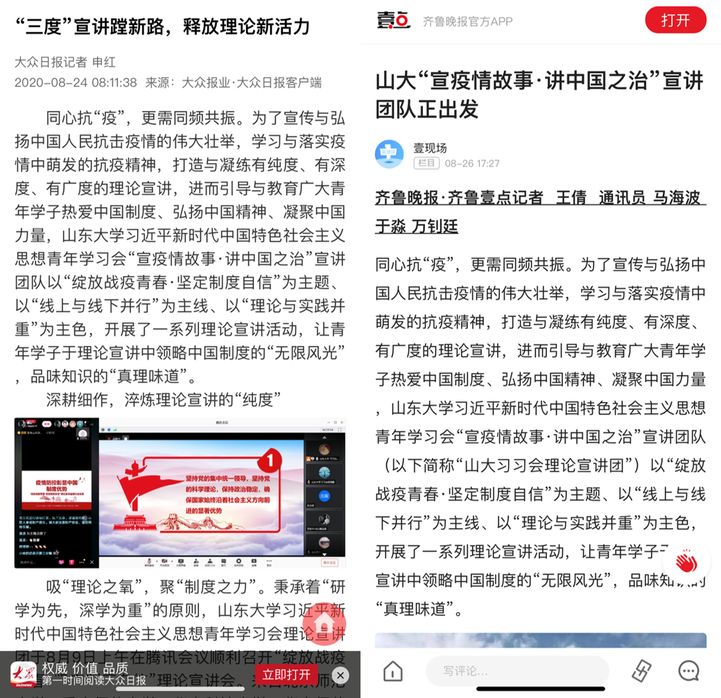 依托“理论研习”、“专题访谈”、“实地调研”等形式,英国上市公司365习习会“宣疫情故事·讲中国之治”宣讲团队生动有效地将“党言党语”转化为“民言民语”,越来越多的民众成为了“学”的主角、“讲”的主力,“听”的主体。宣讲团队的宣讲故事得到了大众日报、齐鲁晚报、青春山大公众号、山大小青马公众号等多家媒体的报道。宣讲团队成员的宣讲心得刊登在山大视点、山大日记等多家媒体之上。为人们送上了一场接地气、聚人气、有正气的理论宣讲。