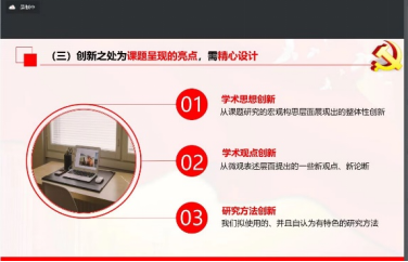 李磊从员工科研创新项目的类型层次、选题讲究的基本原则、项目申请书撰写的注意事项三个方面进行讲解。在员工科研创新项目的类型层次方面,李磊从学科分类、课题级别、课题经费来源、地域和政策导向、申报人年龄层次等多个方面向同学们详细介绍了现有科研课题的发展现状。在选题讲究原则方面,李磊将选题方面总结为五个讲究:一是在选题的关注话题上讲究“高度”,展现大格局,体现党的政策导向,服务于国家战略需求;二是在选题的研究视角上讲究 “新度”,要新颖、前沿,具备冲撞力和感染力;三是在选题的聚焦范围上讲究 “适度”,要尤为注意选题过大的问题,尽可能选择 “小题大做”,切口要小,切面要大;四是要在选题的学术沉淀上讲究“厚度”,尽可能在一个熟悉的、有研究基础的领域内进行选题,以此为基础发挥自己的专长;五是在选题的文字表述上讲究“精度”,要仔细推敲、反复打磨,以求表达准确,精炼无误。在课题申报书撰写方面,李磊围绕选题依据、研究目标、研究内容和创新之处等方面应当注意的细节进行了讲述指导。李磊认为,研究方案是课题论证的重点,需浓墨重彩,但同时也有注意详略得当、深广结合。