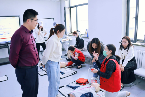 培训活动的第二环节是实操训练。刘长梅借助人体模型,对心肺复苏的手法进行分解示范,向同学们全程演示了正确的心肺复苏操作流程。在医学融合与实践中心杨金玲、孟晓慧、刘长梅、尹金岭、程汉智、衣明慧各位老师的分组指导下,同学们亲身体验,在现场利用模型进行心肺复苏和AED除颤仪的急救模拟训练,在实操中进一步掌握急救相关知识和技能。