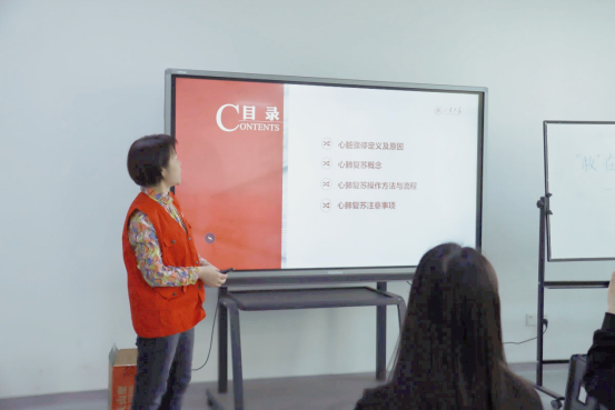 培训活动的第一环节是心肺复苏知识宣讲。刘长梅以数个心脏骤停的案例引入,用通俗易懂的语言为大家生动细致地讲解了心肺复苏的操作流程以及AED除颤仪的使用方法。她告诉大家在进行心肺复苏时,首先要确认环境安全,做好自身防护;其次是判断意识和反应,检查呼吸及脉搏,并呼叫及时取得AED;再次要循环做胸外按压和人工呼吸;最后根据结果判断是否需要电击除颤。刘长梅还介绍了心肺复苏的注意事项,鼓励同学们通过这次培训学会一项救命术,关键时刻伸出援手,积极参与。