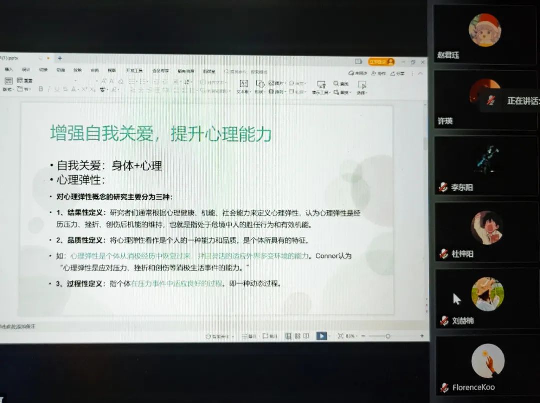首先,曹丽丽从疫情带来的心理影响出发,引出自我关爱与心理弹性的相关内容,以自身员工时代的经历与体验为例,为同学们分享了面对压力与挫折时的应对态度与方法。随后,她从专业的角度,给同学们带来了抑郁情绪与抑郁症的相关科普,助力同学们做好情绪的自我关爱。最后,曹丽丽老师多次与同学互动,了解同学们的实际情况,进行交流与指导,为同学们答疑解惑,同学们收获颇丰。