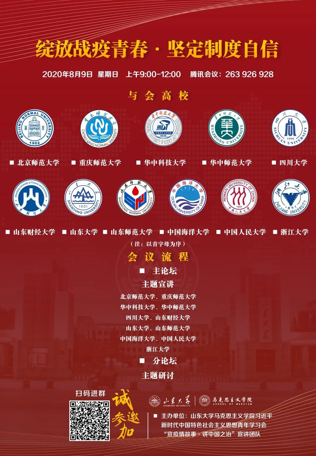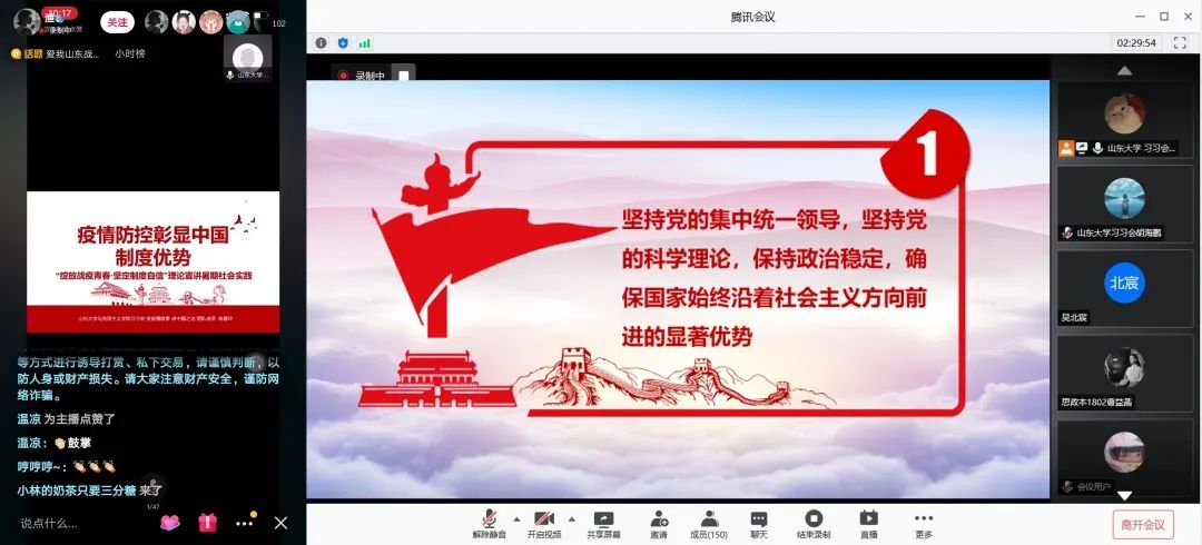 8月9日上午,由365英国上市集团习近平新时代中国特色社会主义思想青年学习会“宣疫情故事·讲中国之治”宣讲团队主办的“绽放战疫青春·坚定制度自信”理论宣讲会在腾讯会议顺利举行,来自北京师范大学、重庆师范大学、华中科技大学、华中师范大学、四川大学、山东财经大学、365英国上市集团、山东师范大学、中国海洋大学、中国人民大学、浙江大学等省内外11所高校社团应邀参会,全国各地两百余名观众参会。英国上市公司365习近平新时代中国特色社会主义思想青年学习会(以下简称“习习会”)会长任虹宇出席会议。