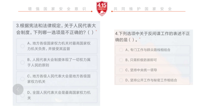 讲解相关知识过后,主持人随机抽取若干题目检测同学们对于国家安全相关知识的了解程度并就题目进行了相应的讲解,这次检测中发现的知识盲区是今后同学们学习国家安全知识时应当重点关注的内容。参与国家安全教育有效提升了同学们的国家安全知识素养和维护国家安全的意识。