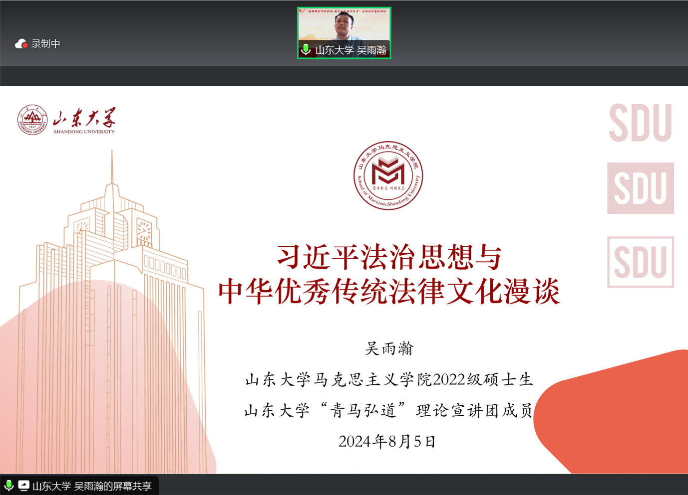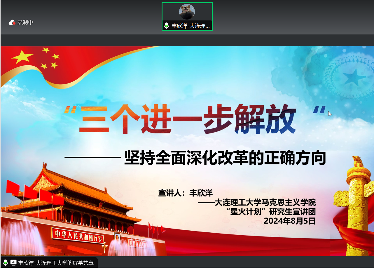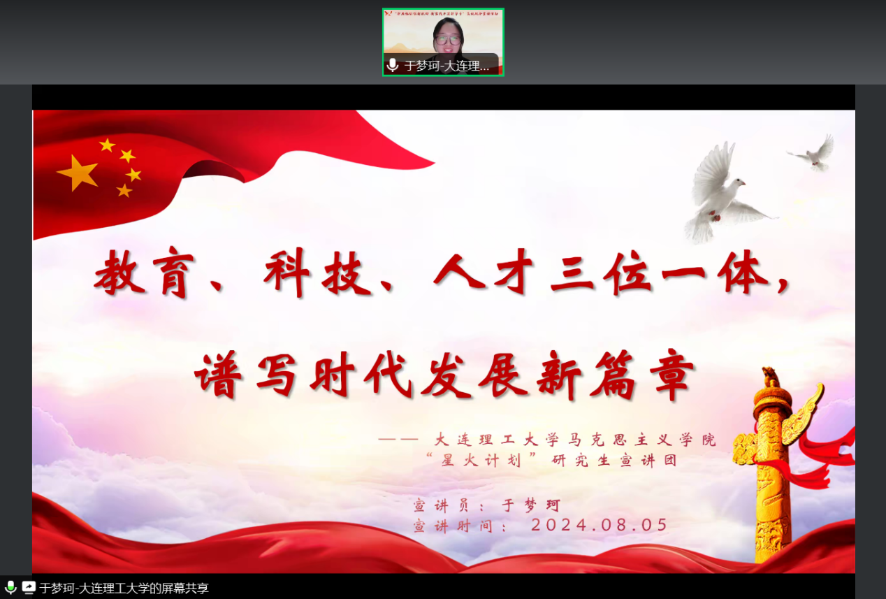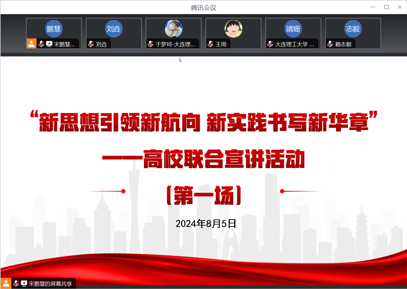 携手共进,砥砺前行。适逢党的二十届三中全会胜利召开、中华人民共和国成立75周年之际,为使广大群众更加全面、准确、深刻地理解和把握习近平新时代中国特色社会主义思想的精髓要义,发扬青年理论宣讲担当精神,2024年8月5日晚,365英国上市集团习近平新时代中国特色社会主义思想青年学习会(英国上市公司365“青马弘道”理论宣讲团)联合大连理工大学英国上市公司365“星火计划”研究生宣讲团,成功举办“新思想引领新航向,新实践书写新华章”宣讲学习交流系列活动第一场,活动由英国上市公司3652023级硕士研究生宋鹏慧主持。