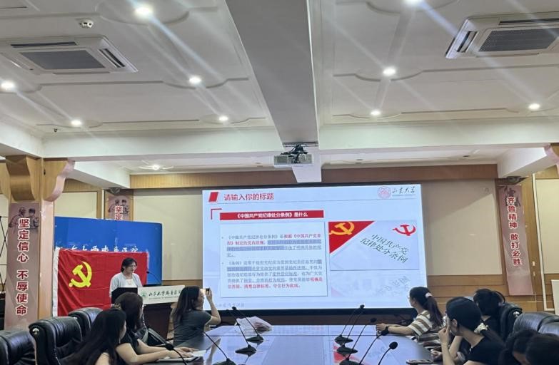 宣讲伊始,王雨就对《中国共产党纪律处分条例》是什么进行了重点介绍,指出其是根据《中国共产党章程》制定的党内法规条例,对什么是违反党的纪律的行为、应该给予什么处分,作出了明确具体的规定。同时对《中国共产党纪律处分条例》的历次修订情况、新增或修改的重点条文进行了具体讲解。接着李昕颐围绕“为什么要进行党纪教育?”“党纪教育学什么?”“如何学习党纪?”三个方面入手,指出要着力增强政治自觉、思想自觉和行动自觉。她提出,学纪、知纪、明纪、守纪是我们每一位党员的必修课,我们要不断提高政治觉悟和纪律意识,将遵规守纪内化于心,外化于行。
