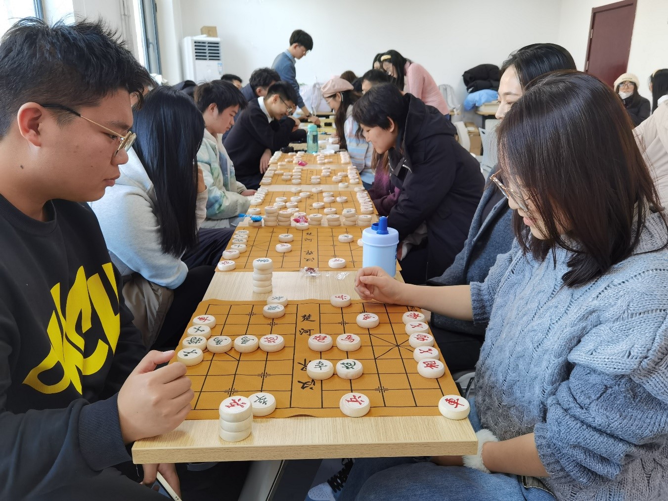 楚河汉界烽烟起。象棋是一项拥有两千多年历史的竞技棋类运动,咫尺棋盘,楚河汉界,每一局都演绎着金戈铁马的纷争。18位同学按照分组一对一展开博弈,在楚河汉界两端斗智斗勇。棋盘之上,兵来卒往,纵马横车;棋盘之外,认真琢磨,见招拆招。赛后师生一起交流心得,友谊对弈,收获满满。