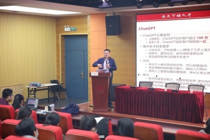 活动的第一阶段,两位专家分别从不同的角度为同学们进行了讲解。郭晓东主任首先从技术角度对ChatGPT的出处、特点、典型应用等内容进行分享。他从技术本身的安全性上引入,讲解了ChatGPT在技术可信度、学术知识产权、意识形态、安全与隐私等方面带来的风险挑战,阐明了ChatGPT的良性发展需要从法治监管、政策引领与技术创新方面进行引导。他表示,ChatGPT是把双刃剑,需要我们积极应对其机遇与挑战。