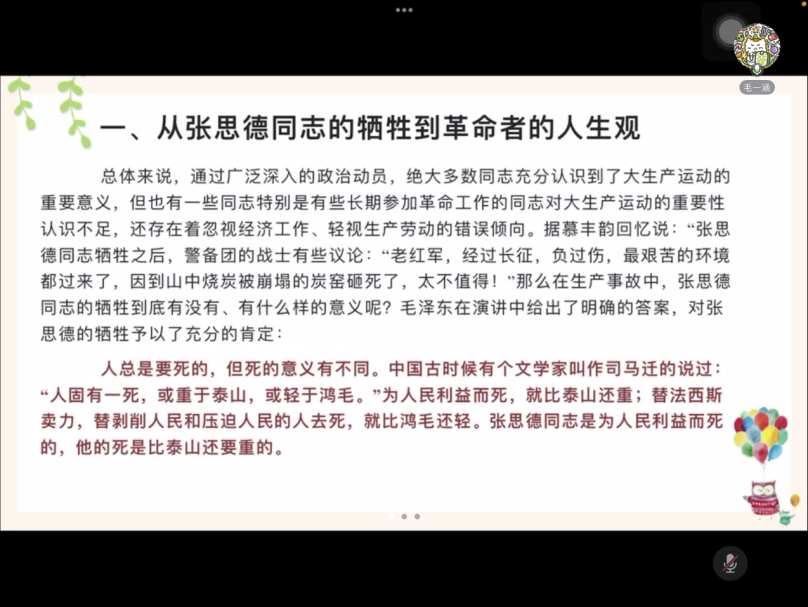 《为人民服务》组的同学就写作背景、文章内容、时代意义三个方面展开了分享。认为党的十八大以来,习近平总书记把为人民服务阐释为中国共产党的初心,强化为中国共产党的根本政治立场,明确为衡量党员干部理想信念是否坚定的客观标准,落实为以人民为中心的发展理念和政策。在新的历史时代深刻回答了“为了谁、依靠谁”这一根本性问题,彰显了新时代中国共产党人的鲜明价值取向,将毛泽东为人民服务思想的传承发展推向了一个崭新的高度。