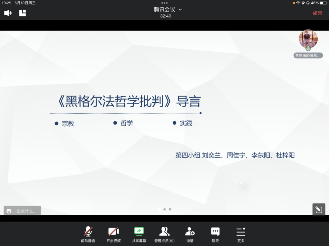 第三党小组成员对近期所阅读的《<黑格尔法哲学批判>导言》、《1844年经济学哲学手稿》、《文明的冲突》、《哥达纲领批判》等马克思主义经典文本进行了全面系统梳理,围绕其写作背景、整体思路、主要观点、历史影响、时代价值等方面作了展与示分享,并就自己的阅读心得进行了充分交流与探讨。
