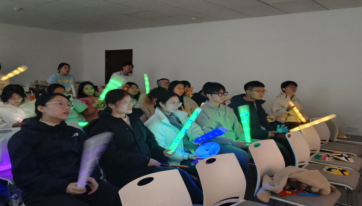 在“蒙面 K 歌,放声解压”活动中,同学们戴上独特的京剧脸谱面具,挥动荧光棒和拍手器,在轻松愉快的氛围中放声高歌。“一条大河波浪宽,风吹稻花香两岸”“最初的梦想紧握在手上”,经典红歌、流行金曲和自由点歌环节轮番上阵,同学们在或高亢或舒缓的旋律中丢掉生活烦恼、释放心中压力,感受集体的温暖与力量。