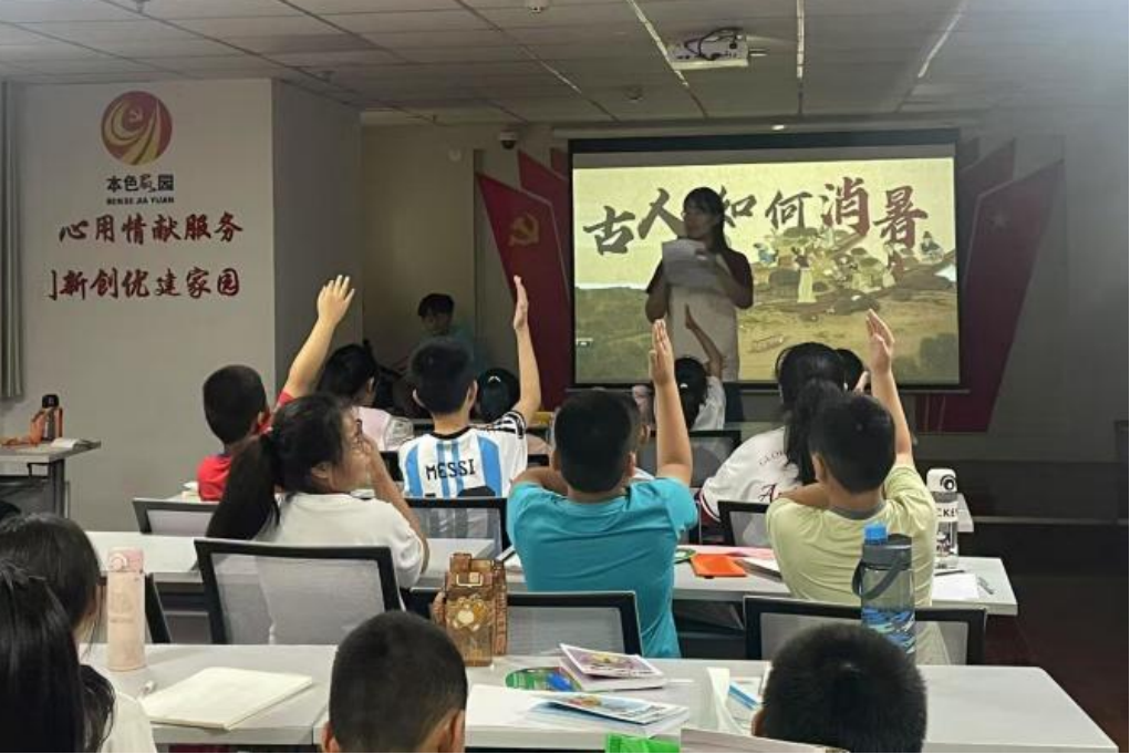 接下来,实践团队走进裕园社区“成长加油站”,为社区青少年带来一堂别开生面的趣味历史课《古人如何消暑》。团队成员张海萱带领孩子们感受古人的生活美学,引导孩子们从诗词作品中感悟古人的智慧与哲思。现场气氛十分热烈,孩子们踊跃参与提问环节,在寓教于乐中深化了对传统文化的认知与理解。此次公益课堂的开展,为社区青少年的暑期教育注入了全新活力,营造了良好的文化育人环境。