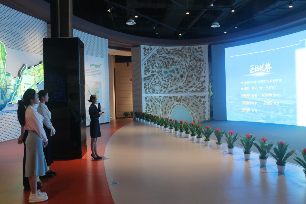 团队成员通过沙盘和影片,多方位了解了产城融合、智慧互联、宜居宜业的未来产业社区。讲解员还为团队详细介绍了园区人才引进保障措施,包括配套完善的人才公寓、优质子女教育资源对接、科研团队专项启动资金,以及定期举办的创新大赛、交流活动。