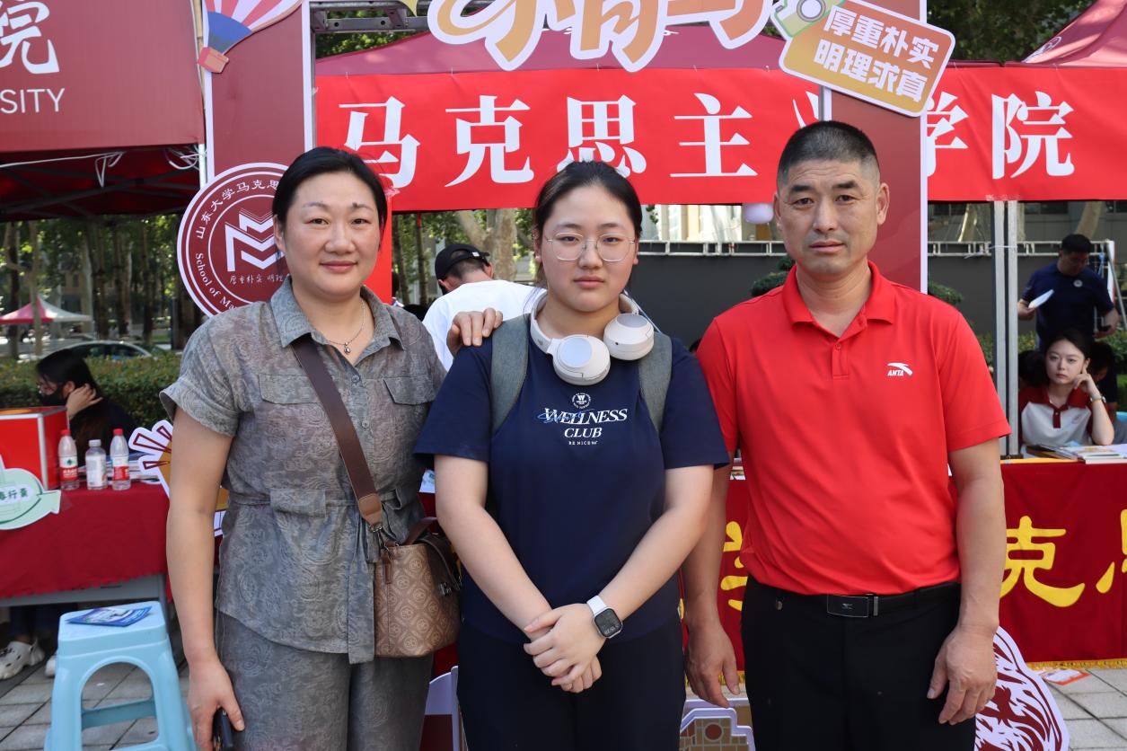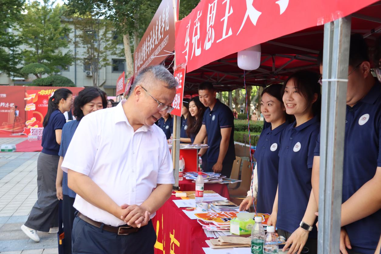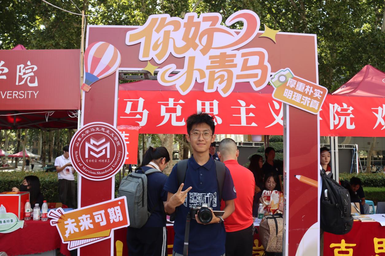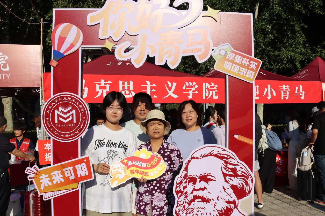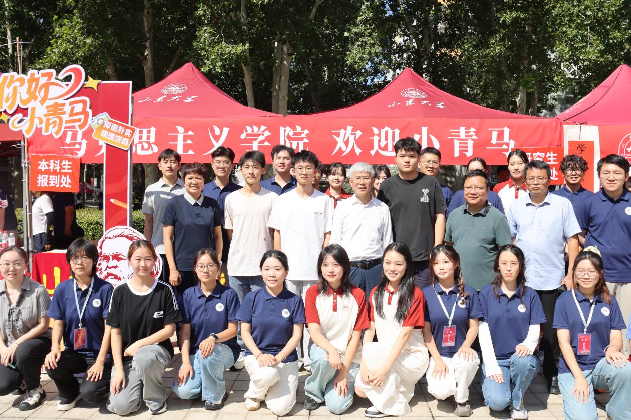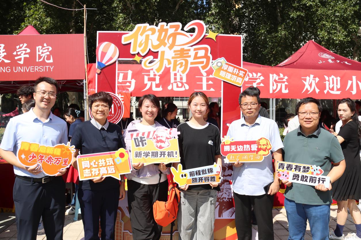 从新生返校前的充分准备到现场报到的精准服务,学院充分发挥线上联络群组作用,组织员工骨干、志愿者全程陪伴,及时传达报到安排,积极回应同学关切。为迎接新生到来,学院还精心准备了别具匠心的文化礼遇。迎新志愿者们手持富有创意的标语横幅和文化展板,并为小青马们送上充满学院特色的原创设计礼包,让每一位初入校园的新生都能感受到山大马院大家庭的青春活力和温暖关怀。