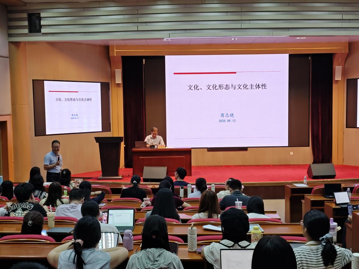 商志晓教授围绕“文化、文化形态与文化主体性”这一主题,为2025级研究生新生带来一堂思想深邃、视野宏大的学术启航课。他首先从文化及其重要地位入手,详细解析了文化的内涵与时代价值,并对当前“文化热”现象作了深入剖析;进而辨析文化与文明的联系和区别,界定文明判定标准并强调社会礼仪的关键作用;通过历史与现实相结合,归纳中国文化形态变迁,阐发中华优秀传统文化的当代意义与现代文化建设方向;重点解读“两个结合”,特别是“第二个结合”的哲学基础、实践路径及其与“第一个结合”的辩证关系;最后围绕文化主体性建构,明晰相关概念特征并提出中华文化主体性建设的实现路径。讲授过程中,商教授还结合自身丰厚的理论积累与实践经验,提出了文化研究方向的宝贵建议,为新生同学后续学习与研究带来深刻启发。