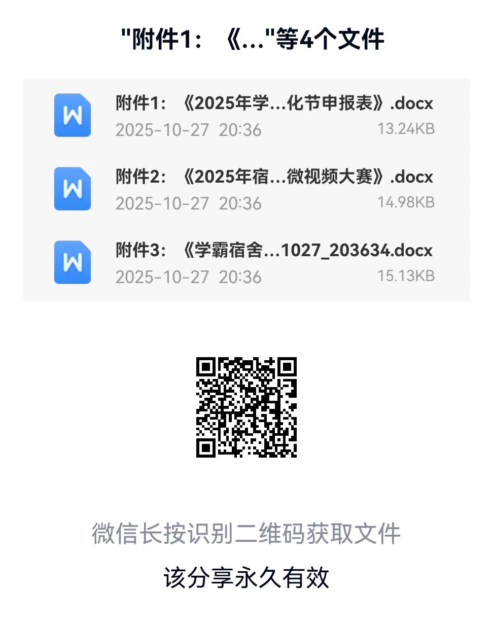 1.所有参赛作品请按照作品报送要求填写相应附件,并于2025年11月17日前将非实物作品与附件打包一并发送至指定邮箱。邮件主题为“宿舍文化节+活动类型+姓名+年级+联系方式”。