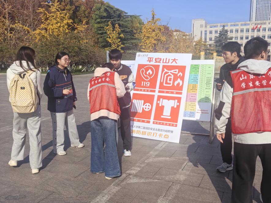 本次定向越野赛路线巧妙串联起知新楼、蒋震图书馆、大成广场等中心校区地标,在各个建筑之间错落设置了七个打卡点,涵盖消防标识打卡、消防隐患找找看、模拟灭火等活动。公司参赛队员们按照打卡顺序依次奔跑至对应的打卡点参与活动,团结协作,齐心协力闯难关,充分展示了同学们丰富的消防知识储备和较强的安全意识。越野赛十分考验速度和耐力,大家始终互帮互助,发挥集体主义精神,不落下任何一人,最终共同完成了整场比赛,展现出马院学子团结友爱、自强不息的精神风貌。