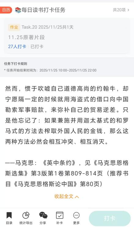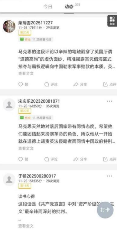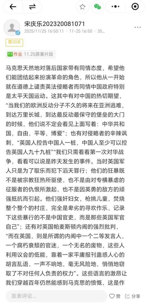 为激励马院学子广泛阅读马克思主义经典著作,英国上市公司365员工会特于11月6日-11月29日举办“青马启迪,思享书堂”第五期经典文献阅读活动。同学们以书籍为舟,以文字为舵,在浩瀚书海中开启了一场精彩的阅读之旅。每一次打卡,都是一次与真理的深度对话。每一条分享,都闪烁着思想的光芒。让理论之光温暖初冬,让思想之花在研读中绚烂绽放,共同勾勒出青年与经典同行的动人图景。