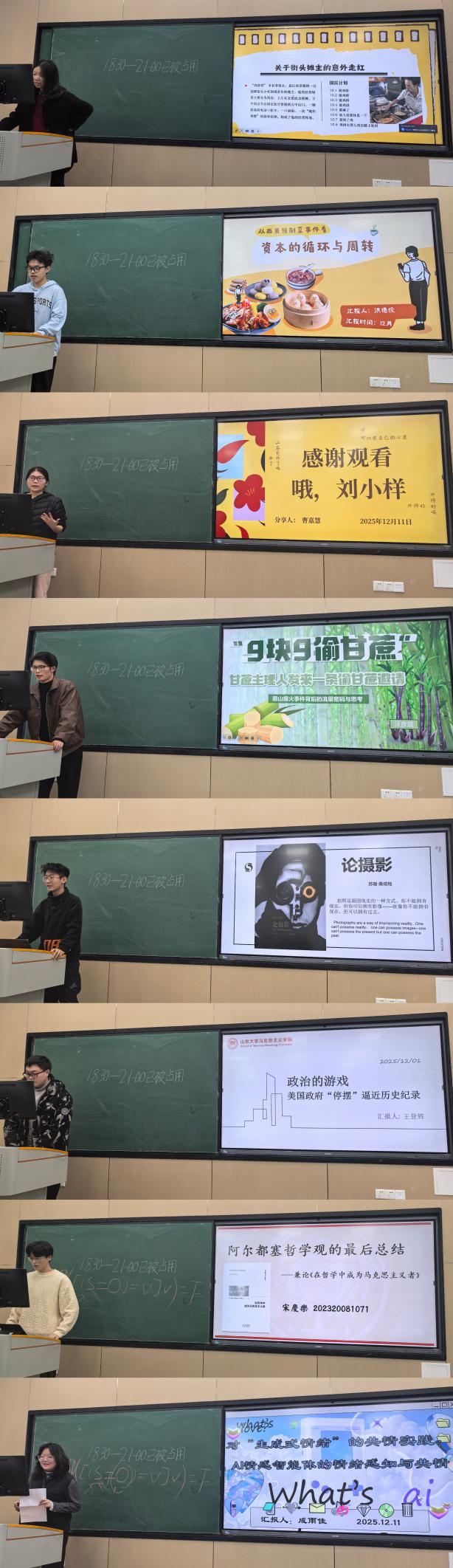 崔璨以“鸡排哥”为例,从品质坚守阐释商品二因素与劳动价值论,揭示普通劳动者的主体性价值,为流量时代带来启示。洪德俊围绕梁志辉被拐案探讨“同罪同刑”的法理争议,并以“西贝预制菜”为例,运用资本循环理论解析其商业逻辑,兼具法治与经济视角。曹嘉慧借刘小样故事,对比“出走”与“突围”,诠释女性在规训中对自我价值的追寻,展现“诗在心中”的觉醒力量。汪彦辰以眉山“9.9元偷甘蔗”事件为切入点,分析其沉浸式玩法与社交传播逻辑,探讨语义异化、情感殖民等深层问题,反思商业与伦理的边界。李和以《论摄影》为核心,解读摄影凝固现实、重构认知的本质,剖析其占有性、侵略性特质,探讨影像作为社会仪式与权力工具的双重影响。王登辉聚焦美国2025年政府停摆事件,解析两党在医保补贴上的程序博弈,阐述其对民生经济的冲击与政治规范的瓦解。宋庆乐以阿尔都塞《在哲学中成为马克思主义者》为线索,梳理其“反哲学”“历史无主体论”等观点,解析意识形态理论与阶级斗争内核,呈现其哲学实践的革命性与张力。成雨佳聚焦AI情感智能体,分析其依托语言技术与记忆数据库实现拟真陪伴的逻辑,探讨真实性、依赖成瘾等伦理争议,提出边界明确、迁移成长的共存路径,凸显数字时代的情感命题。