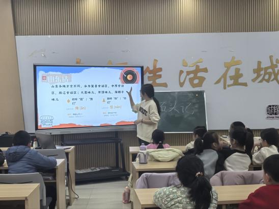 课堂上,实践团成员以“我的家乡话”为核心,从方言的历史渊源、地域特色出发,带领孩子们开启了一场方言文化之旅。课程中不仅介绍了粤语、闽南语、客家话等南方方言的独特魅力,讲解了各地方言的发音特点、经典词汇与代表歌曲,更将重点落在山东本土方言与莒县特色文化上。从济南话亲切的“老师儿”、青岛话极具海洋气息的“哈啤酒、吃嘎啦”,到临沂话豪爽的“中”,再到山东方言独有的倒装句趣味表达,实践团成员通过趣味发音、情景对话、词汇比拼等形式,让孩子们在轻松的氛围中感受山东方言的鲜活韵味。当莒县非遗周姑戏的“拉魂腔”唱腔与莒县方言词汇亮相课堂时,孩子们更是倍感亲切,纷纷跟着实践团成员学说家乡话,沉浸式体验本土语言文化的魅力。
