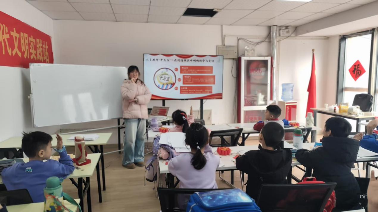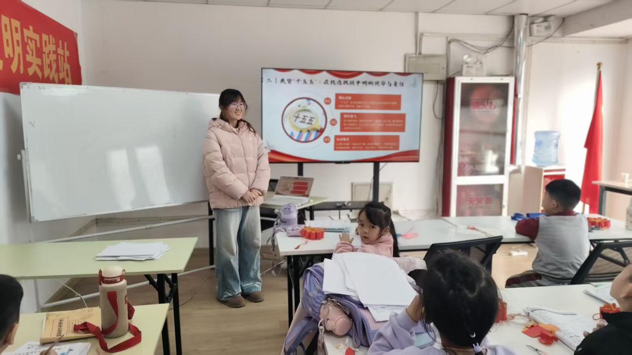 同时,宣讲团提炼出“新质生产力”“安全与发展”“民生福祉”三大全会核心关键词,用浅显直白的表述解读新质生产力的内涵,阐释安全与发展的辩证关系,诠释国家始终坚持的“人民至上”发展理念。结合“十五五”时期的发展机遇与挑战,宣讲团还向小朋友们阐明新时代青年的使命与责任,引导他们将个人成长与国家发展紧密结合,并从做党的创新理论传播者、堪当时代重任的接班人、面向未来的探索者三个方面,鼓励同学们刻苦学习、锤炼品格、勇于创新,以实际行动践行全会精神。